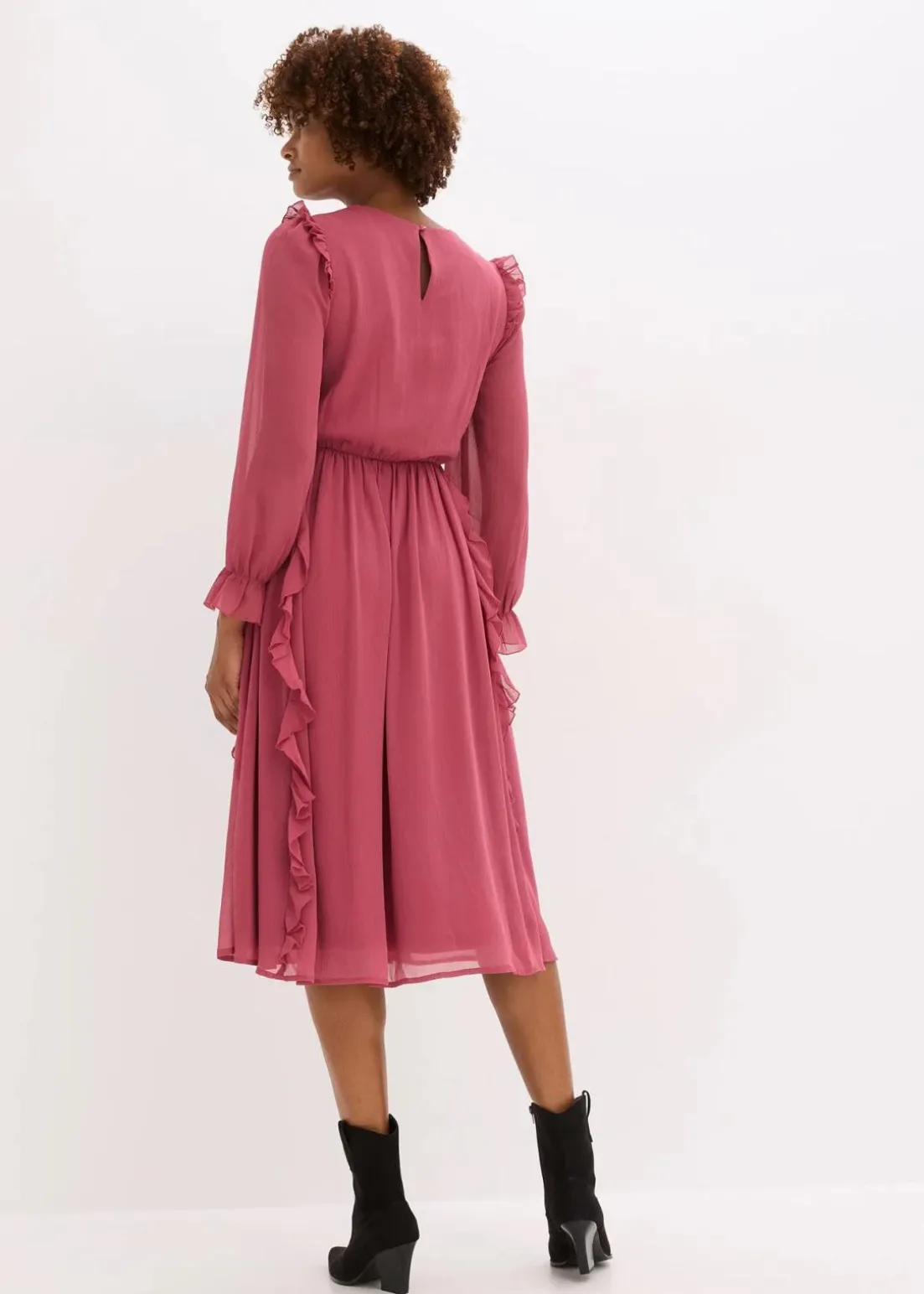 feminines Chiffonkleid in Midilänge mit modischen Volants an der Schulter, am Ärmelsaum und am Rockteil