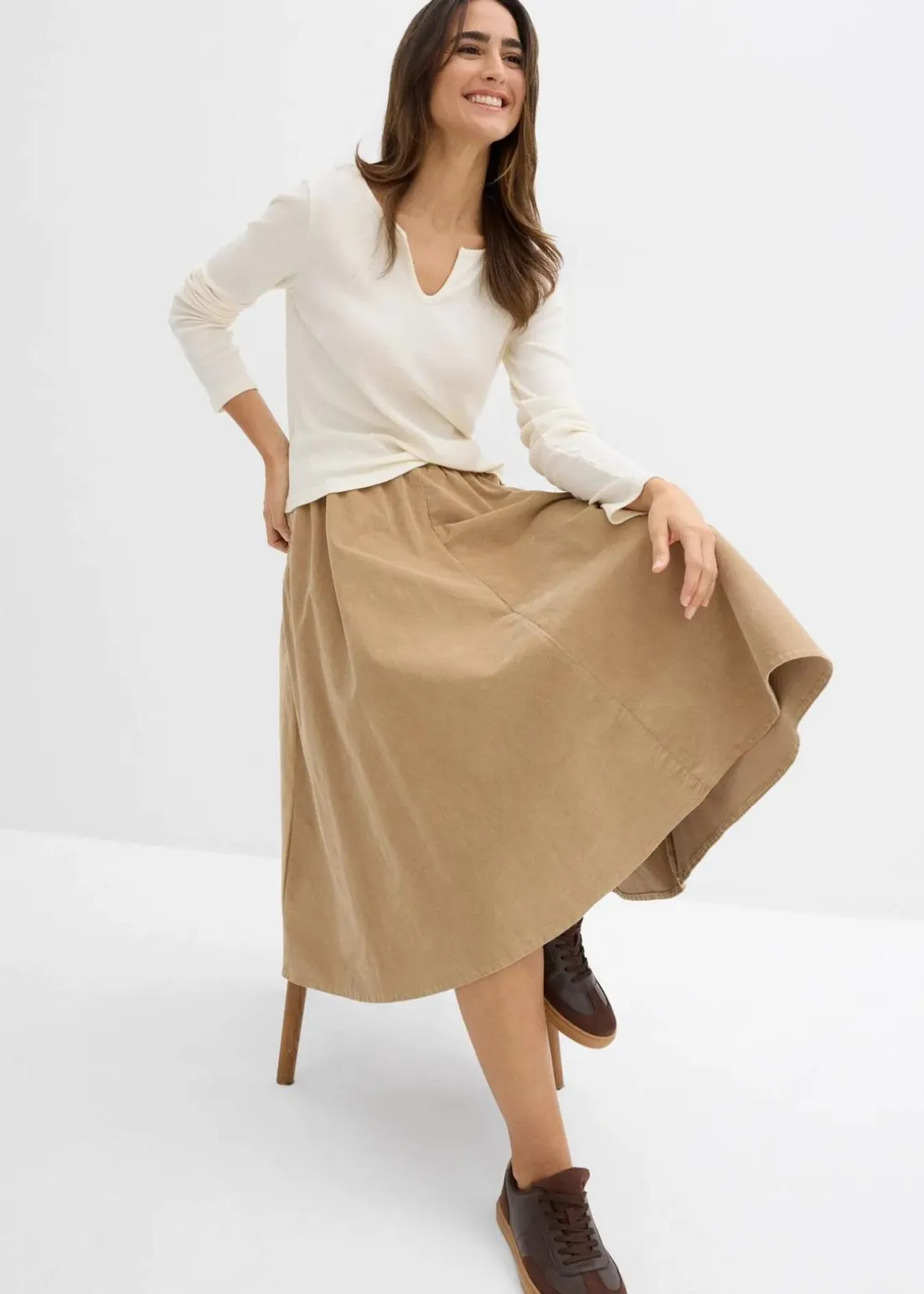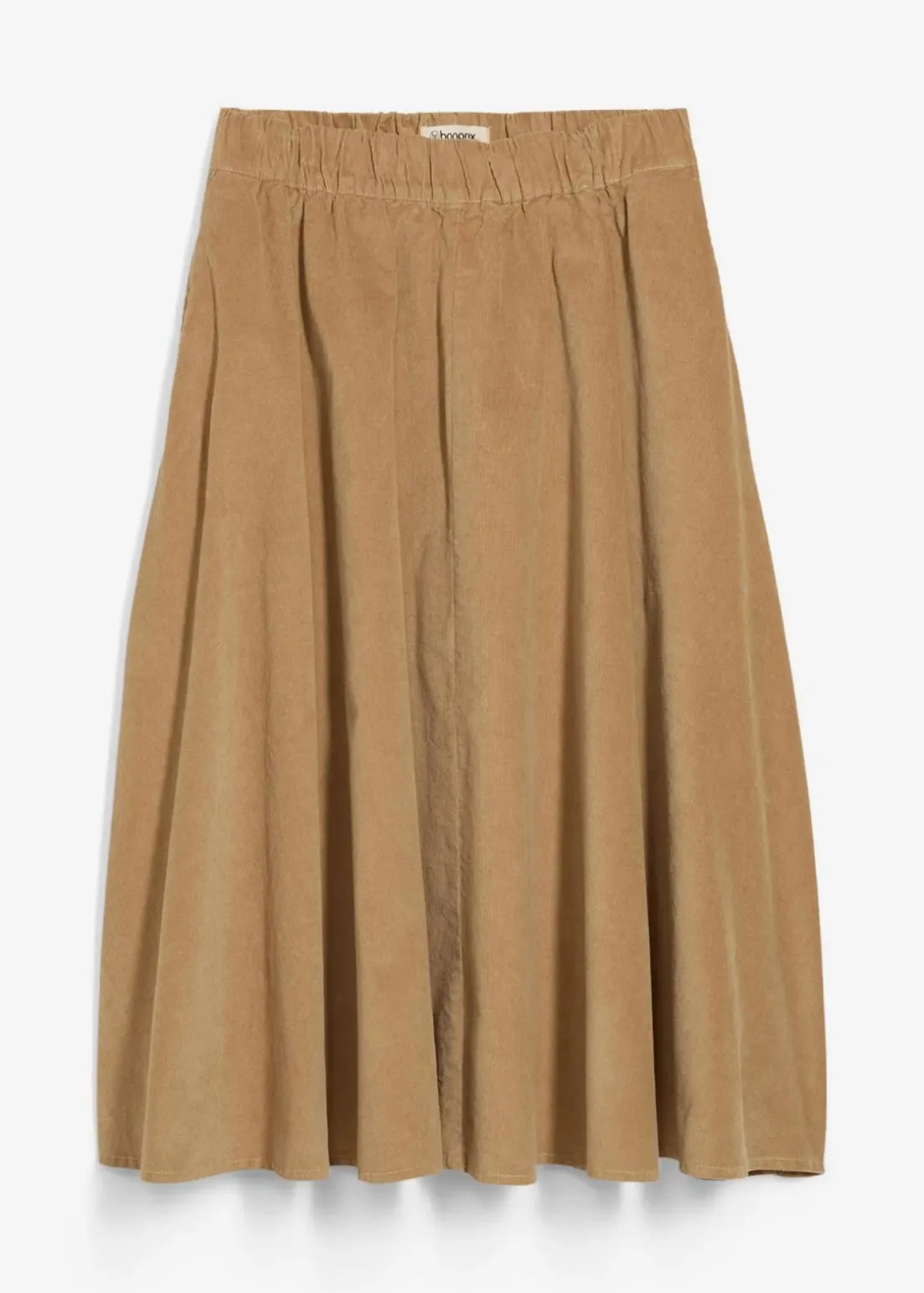 Cordrock mit elastischem Bund und seitlichen Eingriffstaschen.