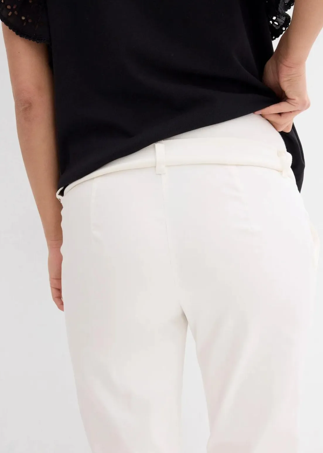Die Umstandshose aus stretchigem Webstoff hat zwei Eingriffstaschen vorne und ist mit Gürtelschlaufen verstehen. Der breite, angesetzte Jerseybund aus Baumwolle sorgt für eine optimale Passform am Bauch. Ein verstellbarer Gummizug im Hosenbund ermöglicht die Regulierung der Weite, somit lässt sich die Hose dem jeweiligen Schwangerschaftsmonat anpassen.