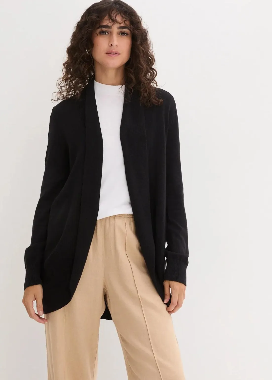 Diese legere Strickjacke aus der aktuellen Kollektion von bpc überzeugt durch hohen Tragekomfort und einen ausgefallenen Schnitt: Die bequeme Jacke hat lange Ärmel mit feinen Ripp-Bündchen und einen abgerundeten Saum.Sie wird offen getragen und lässt sich am besten zu figurbetonten T-Shirts, Tops und engen Hosen kombinieren.
