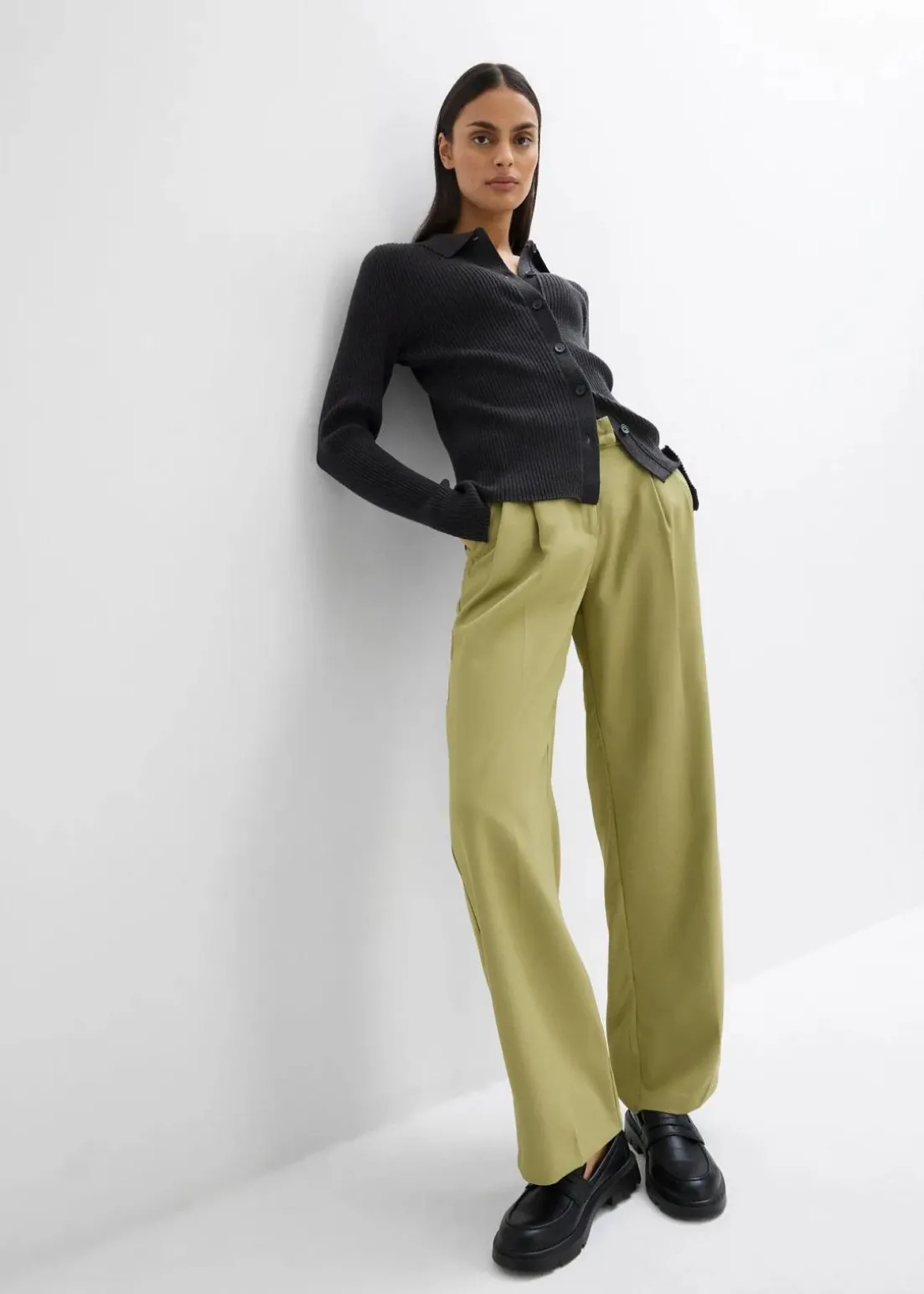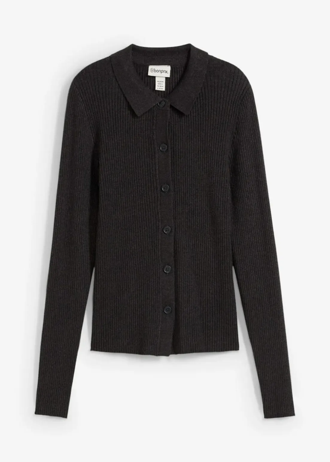 Gerippte Feinstrickjacke in schmaler Passform mit einem spitzen Kragen, farblich passenden Knöpfen und breiten geschlitzten Manschetten