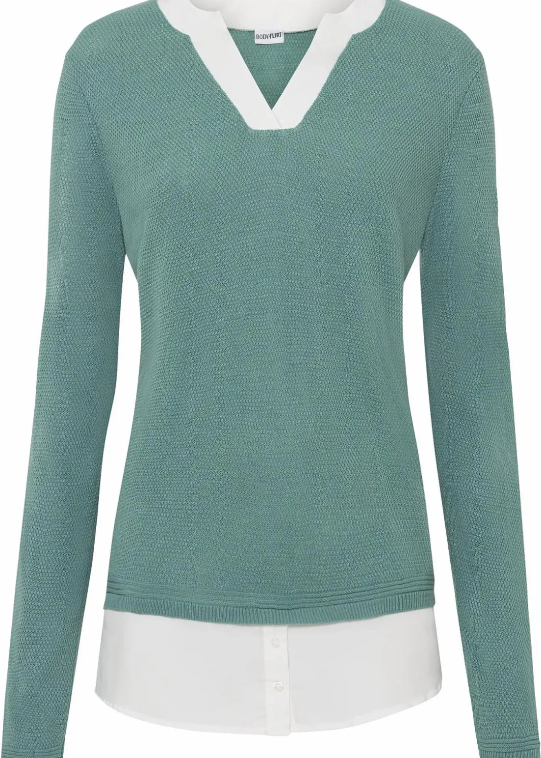 In modischer Lagenoptik ist dieser stilvolle Pullover mit Bluseneinsatz von BODYFLIRT designt. Das Strickoberteil mit feinem Strukturmuster ergänzen kontrastfarbene Einsätze aus glattem, fließend weichem Stoff an der Passe und am Saum. Raffinierte Details sind die kurzen Schlitze an der Seite und die angedeutete Knopfleiste. Der kleine Stehkragen ist dekorativ mit einem V-Ausschnitt kombiniert.
