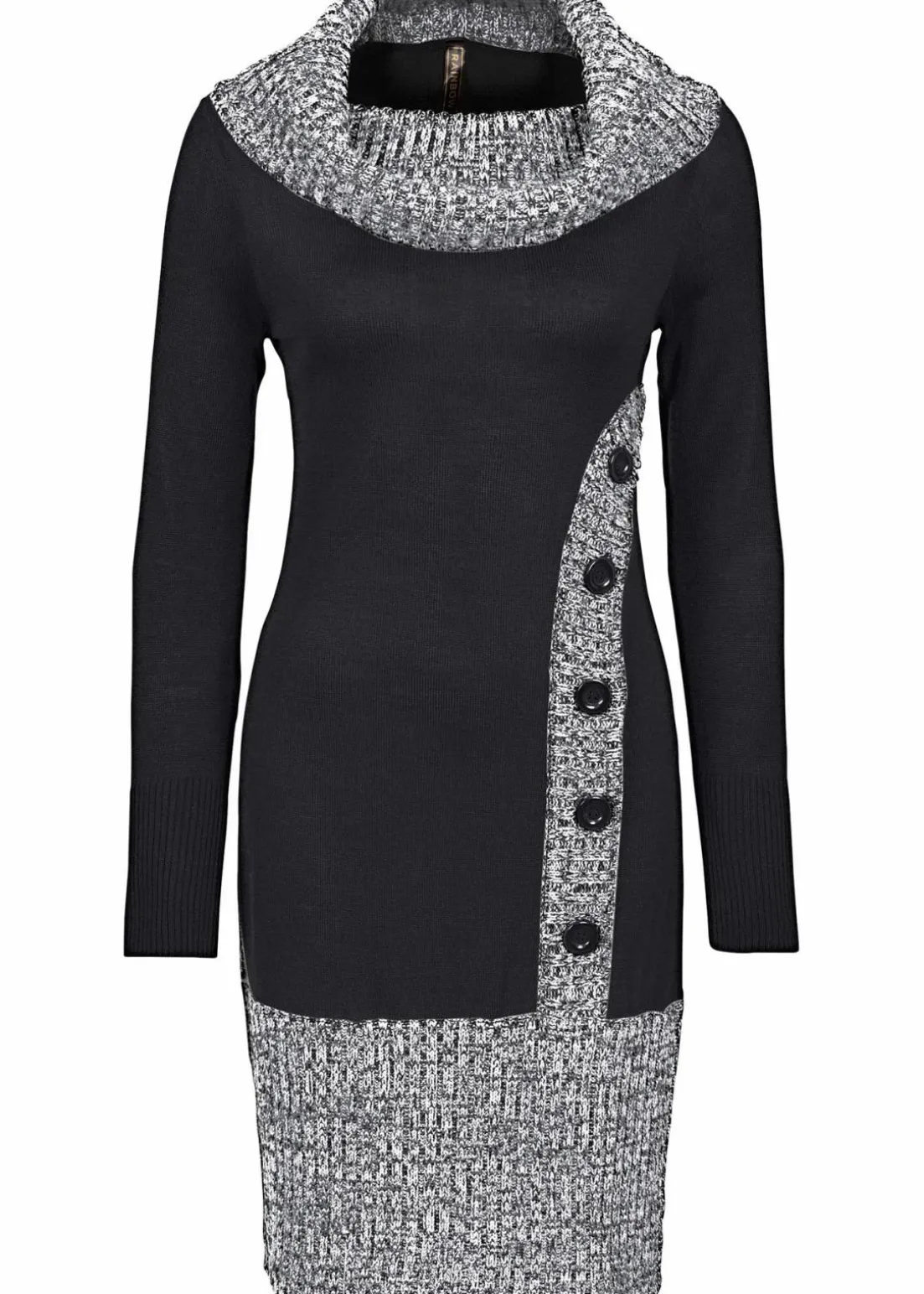 Die melierte Optik gibt diesem Strickkleid von BODYFLIRT boutique eine modische Note. Im Fokus steht der große, schön fallende Rollkragen. Eine kontrastfarbig unterlegte Knopfleiste an der Seite geht in das Rockteil über.Das Strickkleid mit langen Ärmeln sieht vor allem zu Overkneestiefeln stilvoll aus. Ein individueller Look gelingt mit farbigen Strumpfhosen und auffällig gemusterten Ankle Boots.