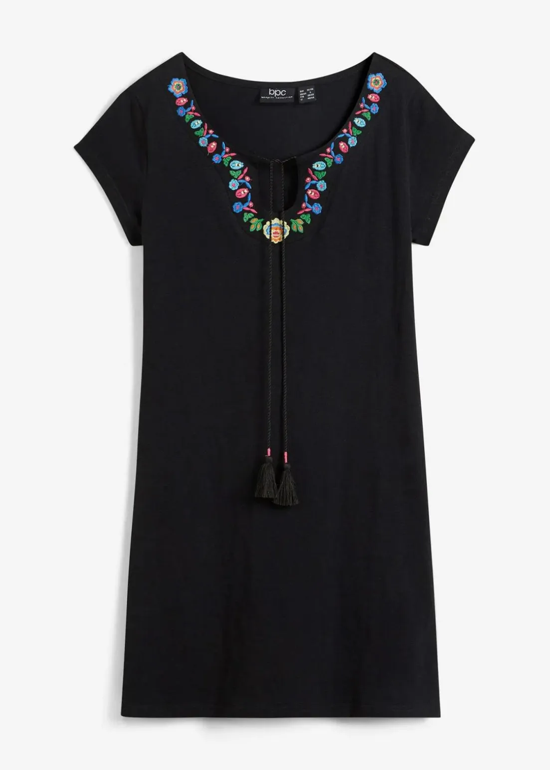 Verspieltes Baumwoll-Shirtkleid mit besticktem Ausschnitt und dekorativen Kordeln