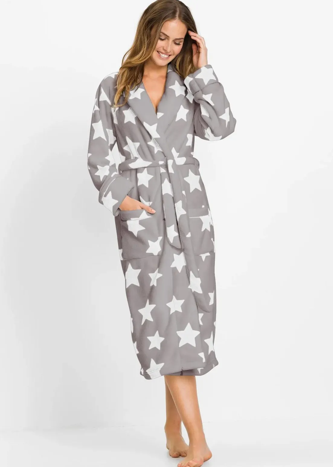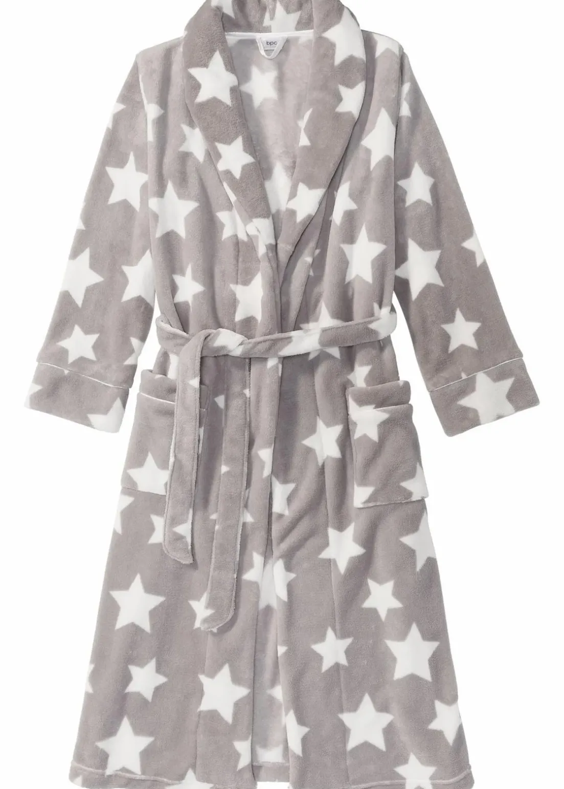 Der Bademantel ist aus flauschiger Fleece-Qualität gefertigt und sorgt für ein kuscheliges Tragegefühl. Das schöne Modell zeigt sich im klassischen Schnitt mit einem Bindeband zum Fixieren und mit zwei aufgesetzten Taschen vorne. Das Sternenmuster setzt einen modischen Akzent. Als komfortabler Begleiter beim Saunagang macht der Bademantel eine gute Figur.