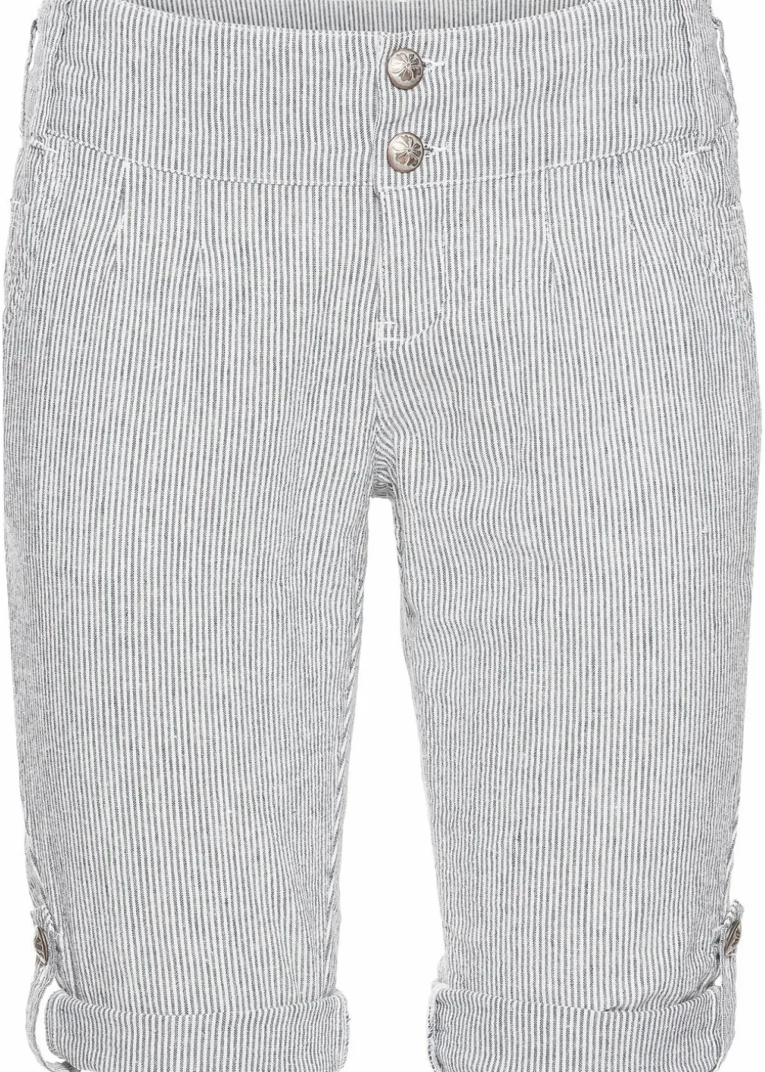 Diese stylishen Shorts mit feinen Streifen verschaffen langen Beinen einen großen Auftritt: Die schmal geschnittene Hose in 3/4-Länge lässt sich bis auf Bermuda-Länge krempeln und mit Knopf und Riegel fixieren. Der breite Taillenbund mit Gürtelschlaufen schließt vorne mit zwei Knöpfen.Die gestreiften Shorts lassen sich zu Tops, Blusen und Shirts tragen.
