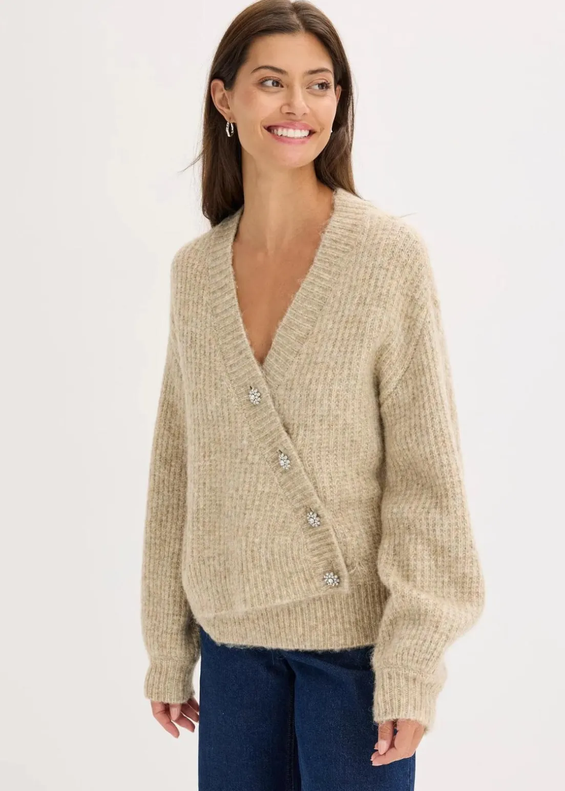 feminine Strickjacke mit asymmetrischem Verschluss vorne und dekorativen Strass-Knöpfen