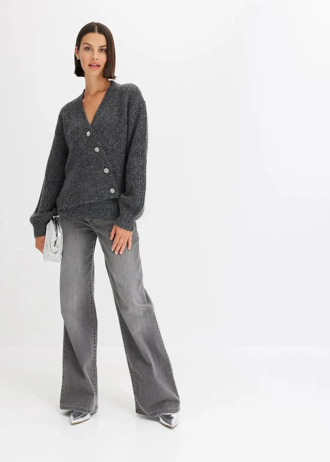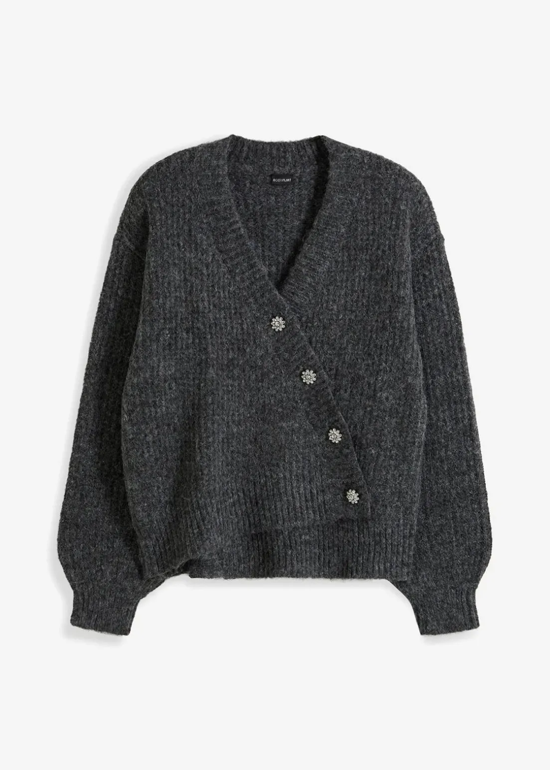 feminine Strickjacke mit asymmetrischem Verschluss vorne und dekorativen Strass-Knöpfen