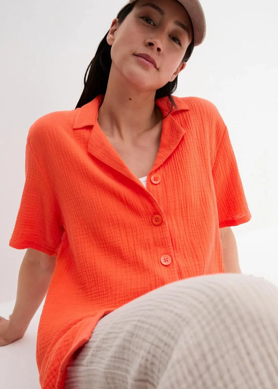 Kurzarmhemd mit überschnittener Schulter und verlängertem Rückensaum. Weite Passform.