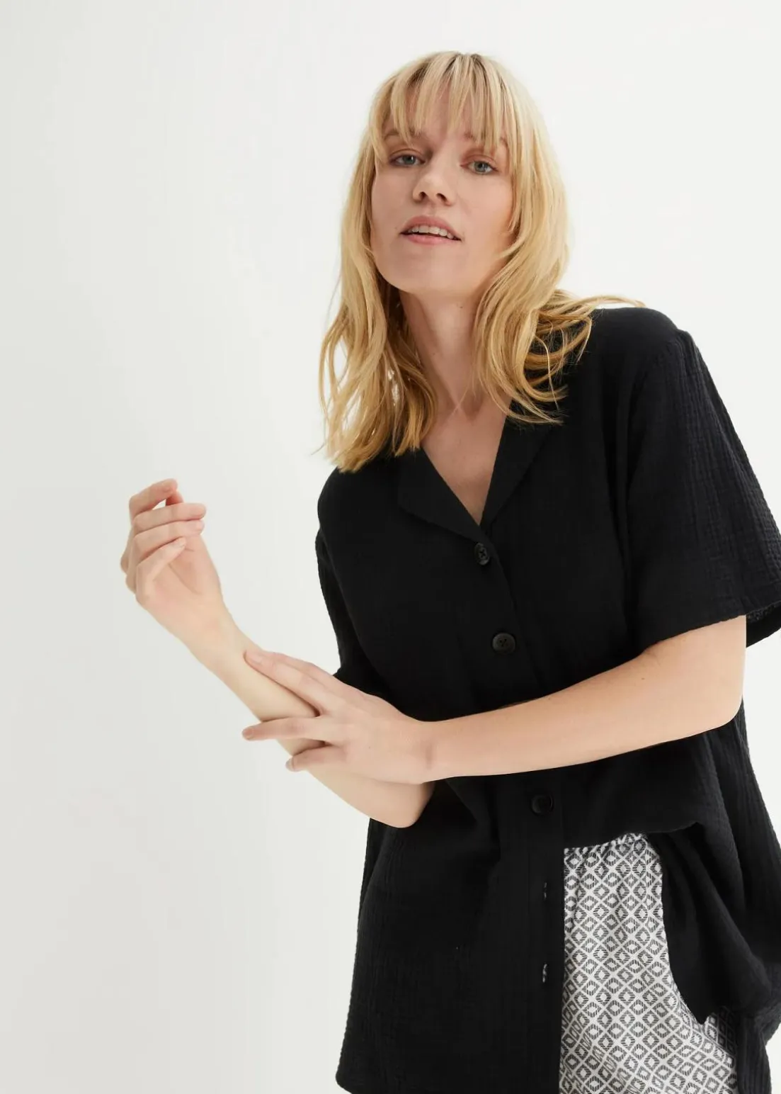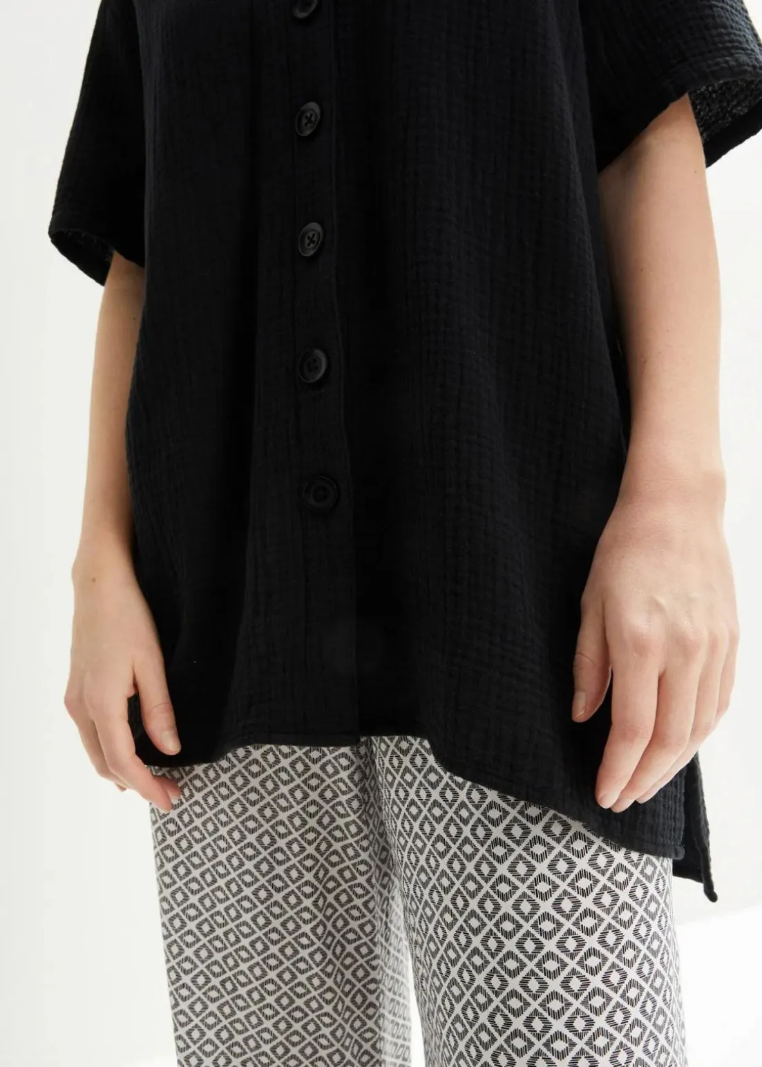 Kurzarmhemd mit überschnittener Schulter und verlängertem Rückensaum. Weite Passform.