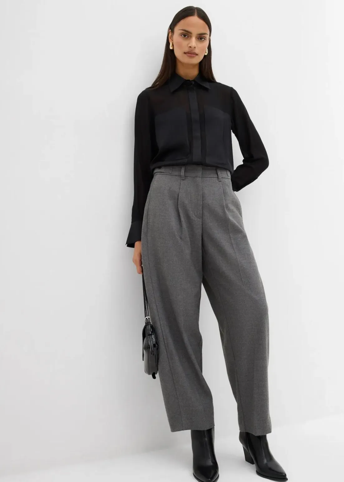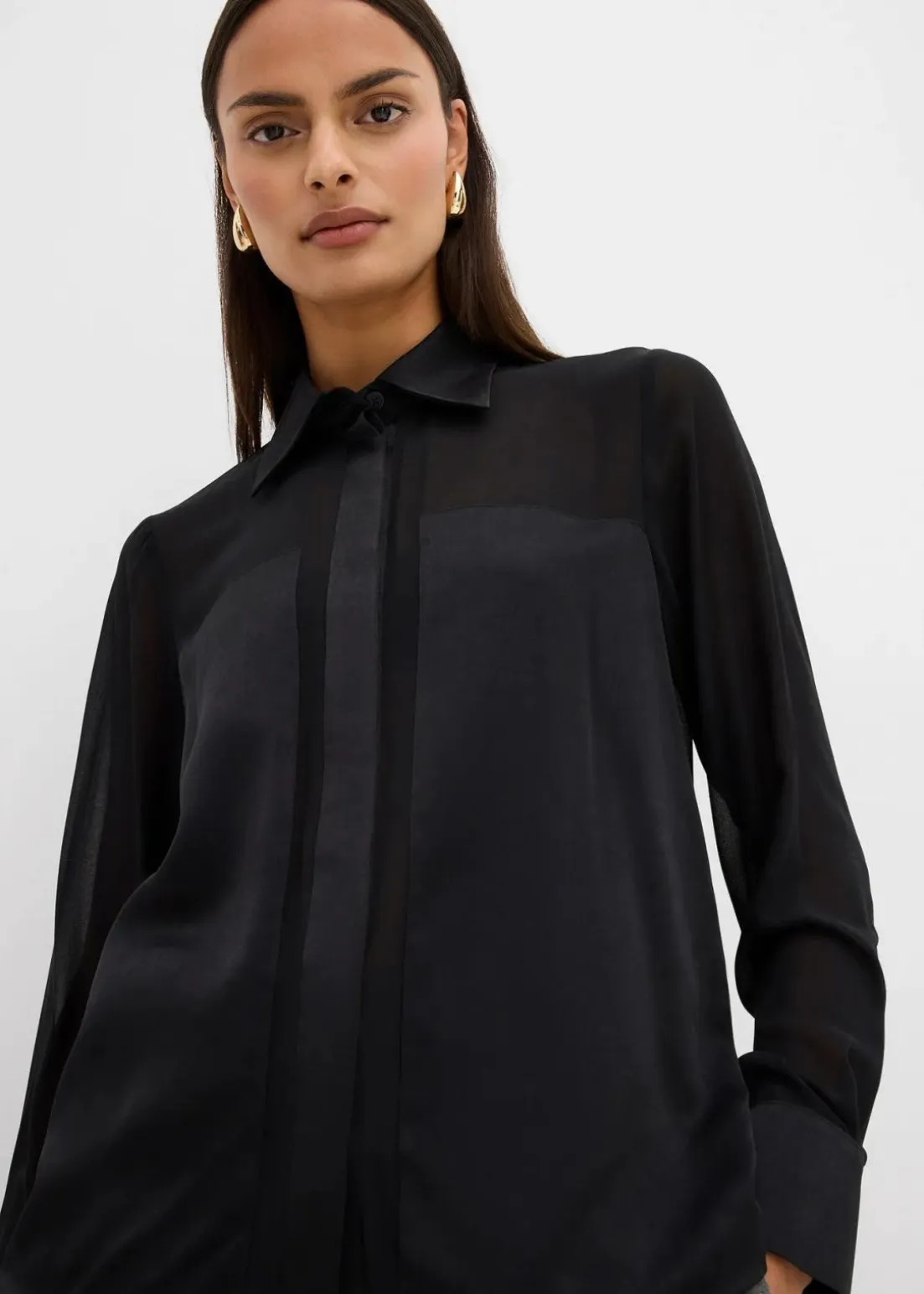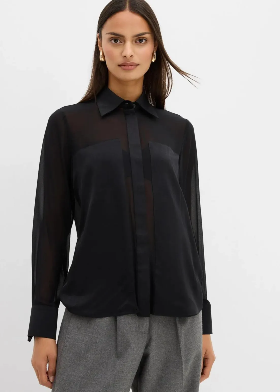 Gerade geschnittene Bluse aus fließendem Stoff mit Hemdkragen, geknöpften langen Ärmeln sowie Knopfverschluss vorne