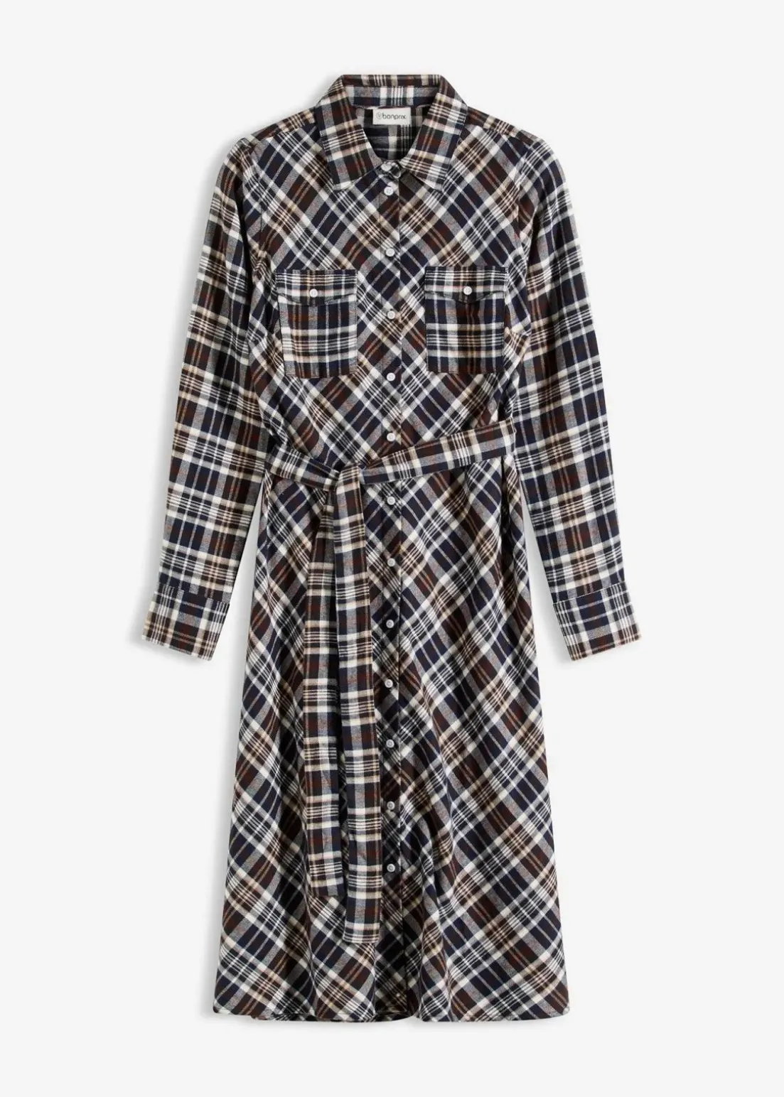 Figurumspielendes Flanell-Kleid aus reiner Baumwolle mit hochgeschlossenem Hemdkragen