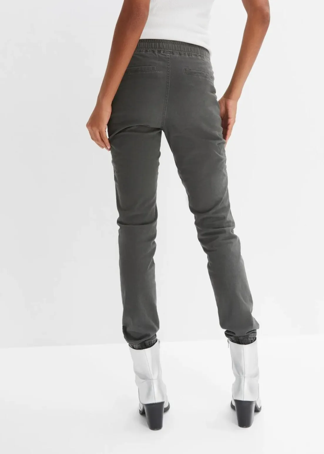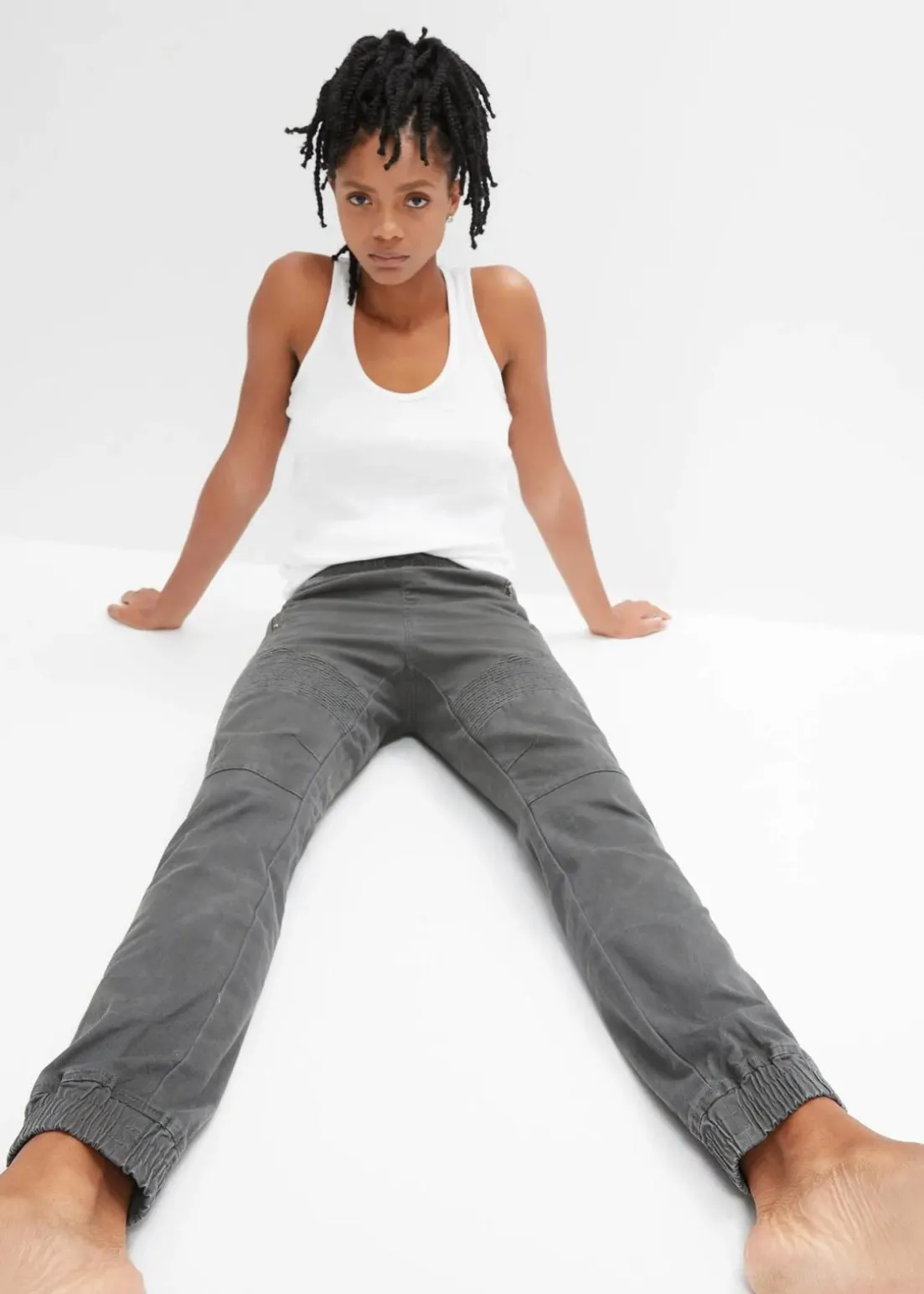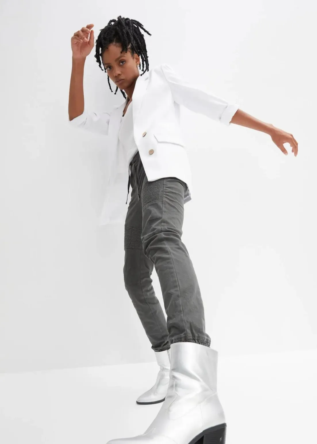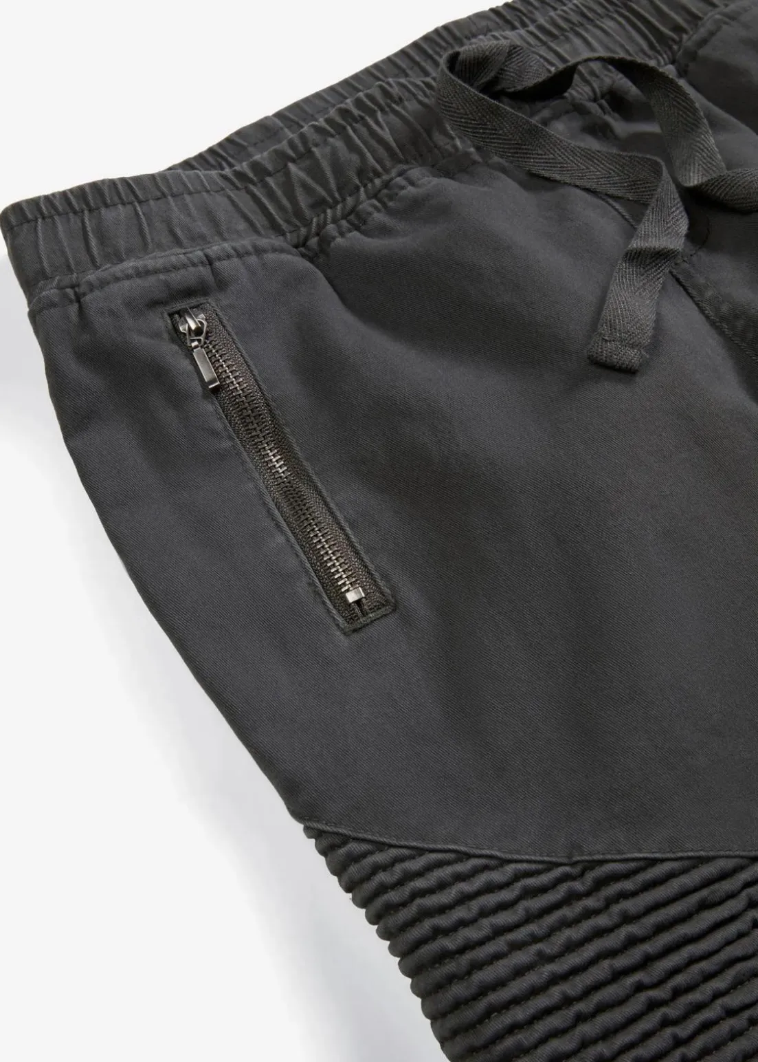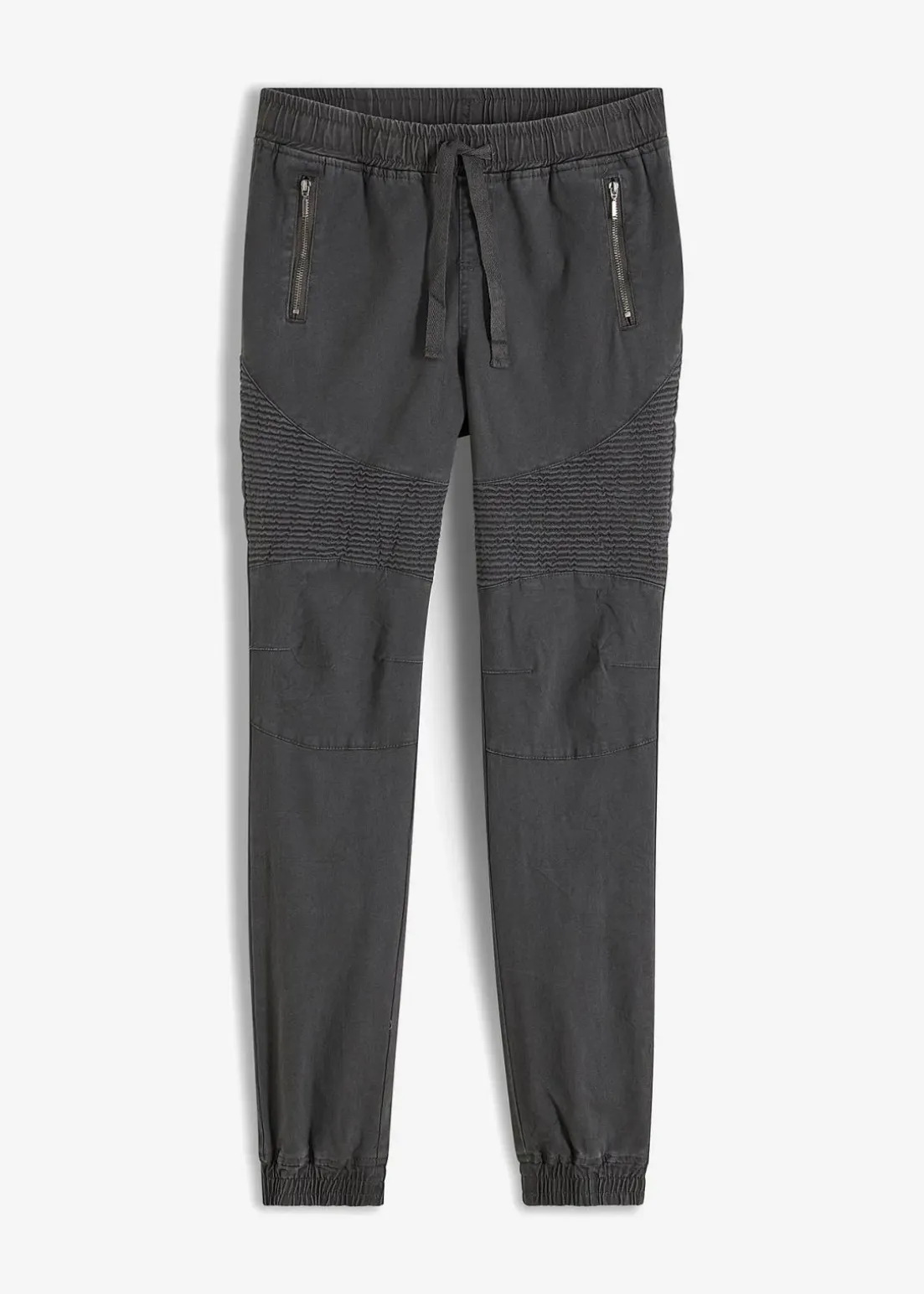 Diese Jogg-Style-Hose verbindet tolle Designs zu einem neuen Look. Die geriffelten Nähte auf Höhe der Oberschenkel erinnern an Bikerhosen. Ein breiter Rundumgummizug mit Bindeband am Bund und die elastischen Bündchen am Beinende sind Elemente von Sweathosen. Auch die schmale Silhouette liegt im Trend.Zwei seitliche Eingrifftaschen mit Reißverschluss runden die coole Jogg-Style-Hose ab. Das Modell überzeugt zu Sweatshirt und Sneakern ebenso wie mit Lederimitatshirt und Boots kombiniert.