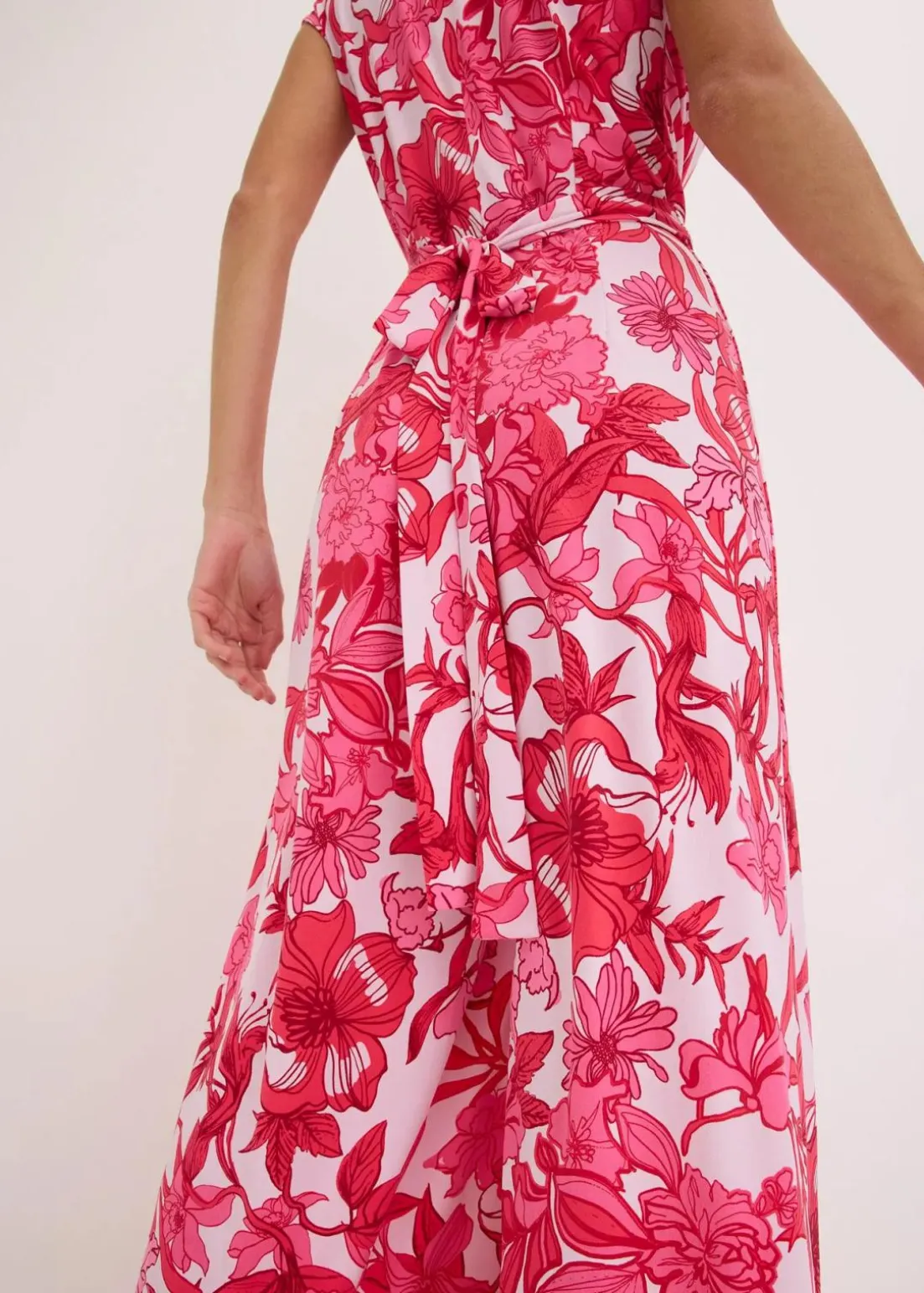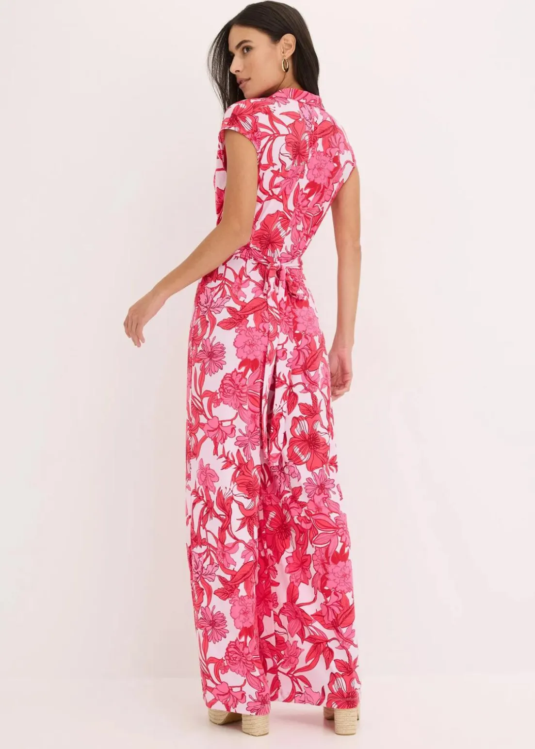 floral bedruckter Jersey-Jumpsuit mit weitem Bein und Drapierung vorne in der Taille die sich durch Bindebänder individuell binden lässt