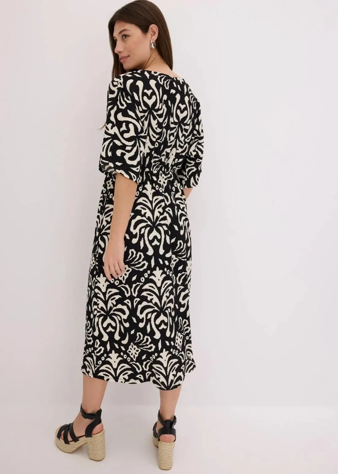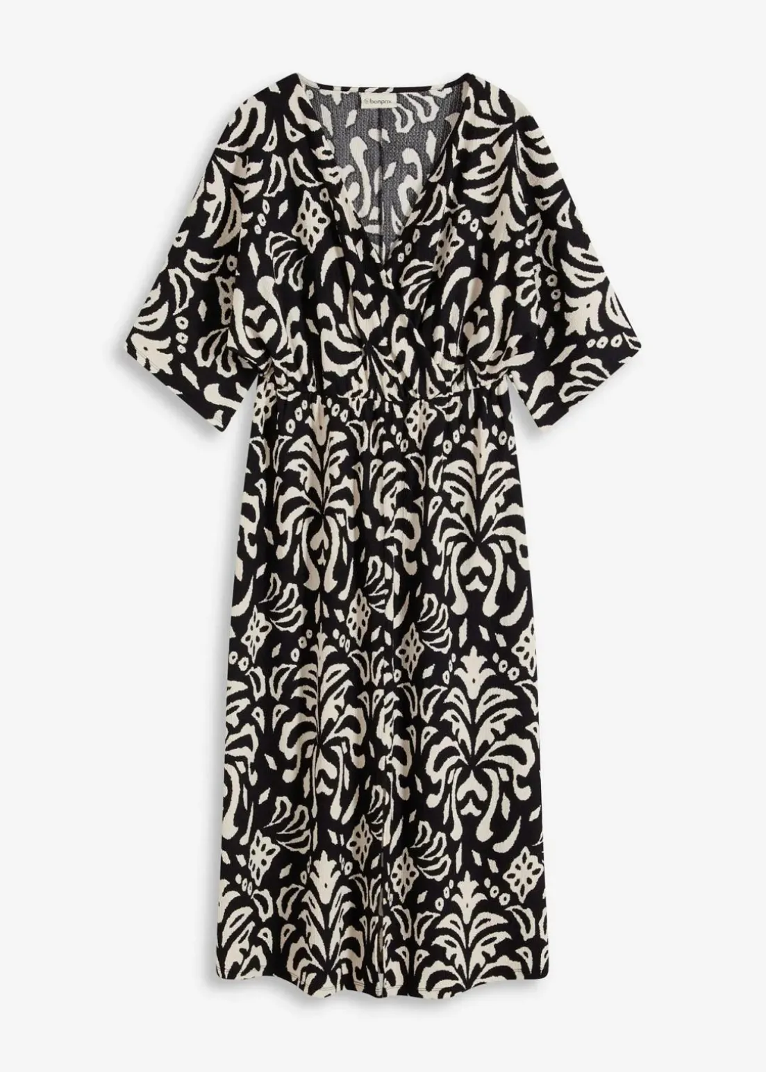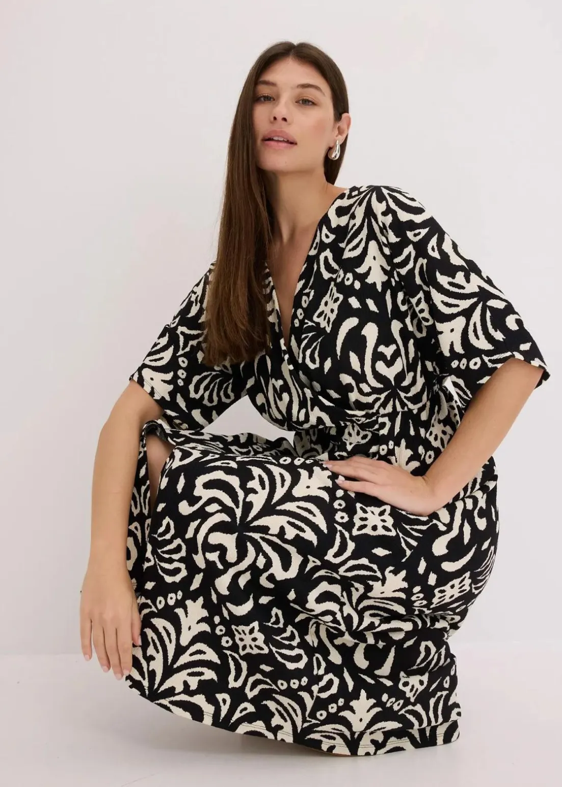modisch bedrucktes Midikleid mit tiefem V-Ausschnitt vorne und Schlitz vorne im Rockteil