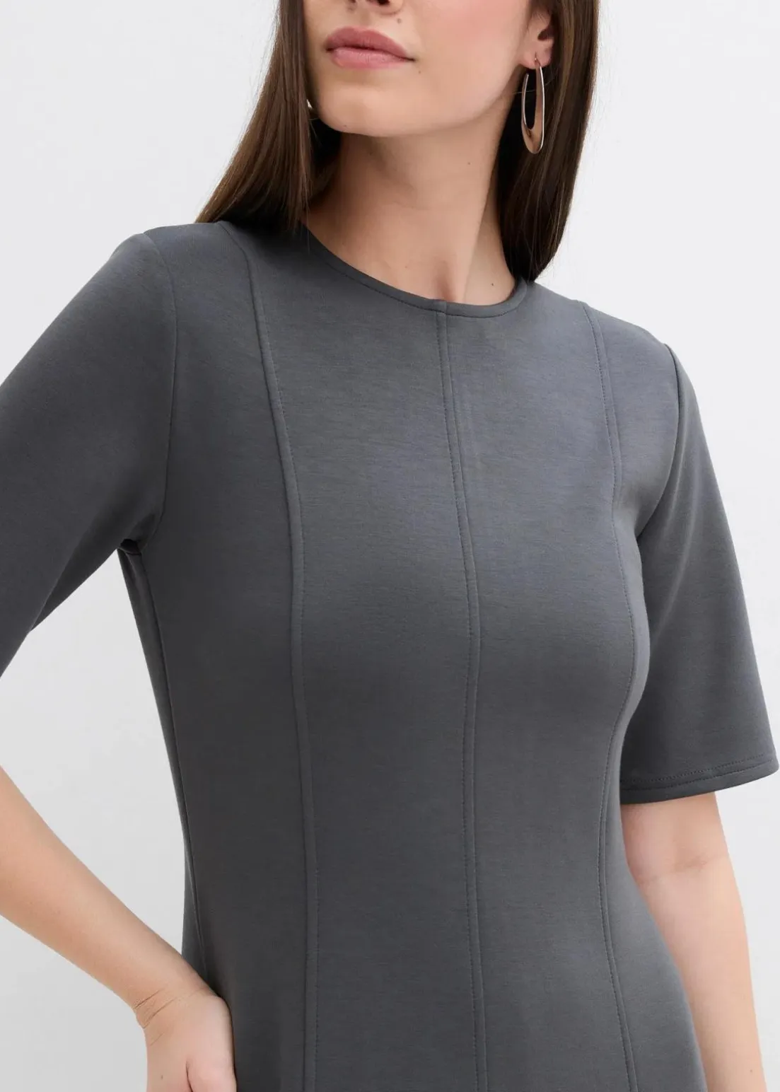 Midikleid mit vertikalen Teilungsnähten sowie einem voluminösem ausgestellten Rock. Verdeckter Reißverschluss hinten.