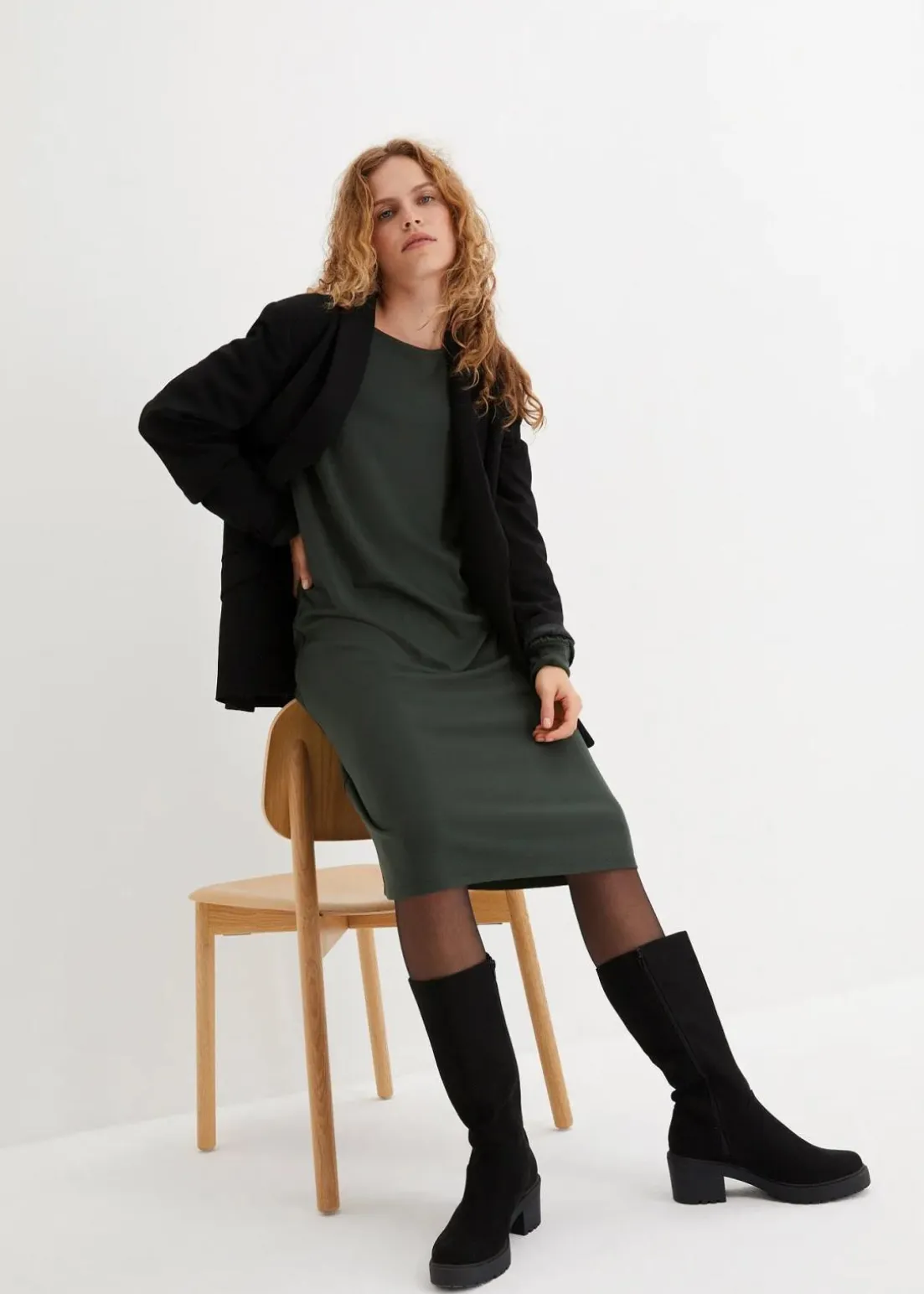 figurumspielendes Kleid aus fester Jersey-Qualität, die Ärmelbündchen sind mit edlen, stoffüberzogenen Knöpfen zu schließen