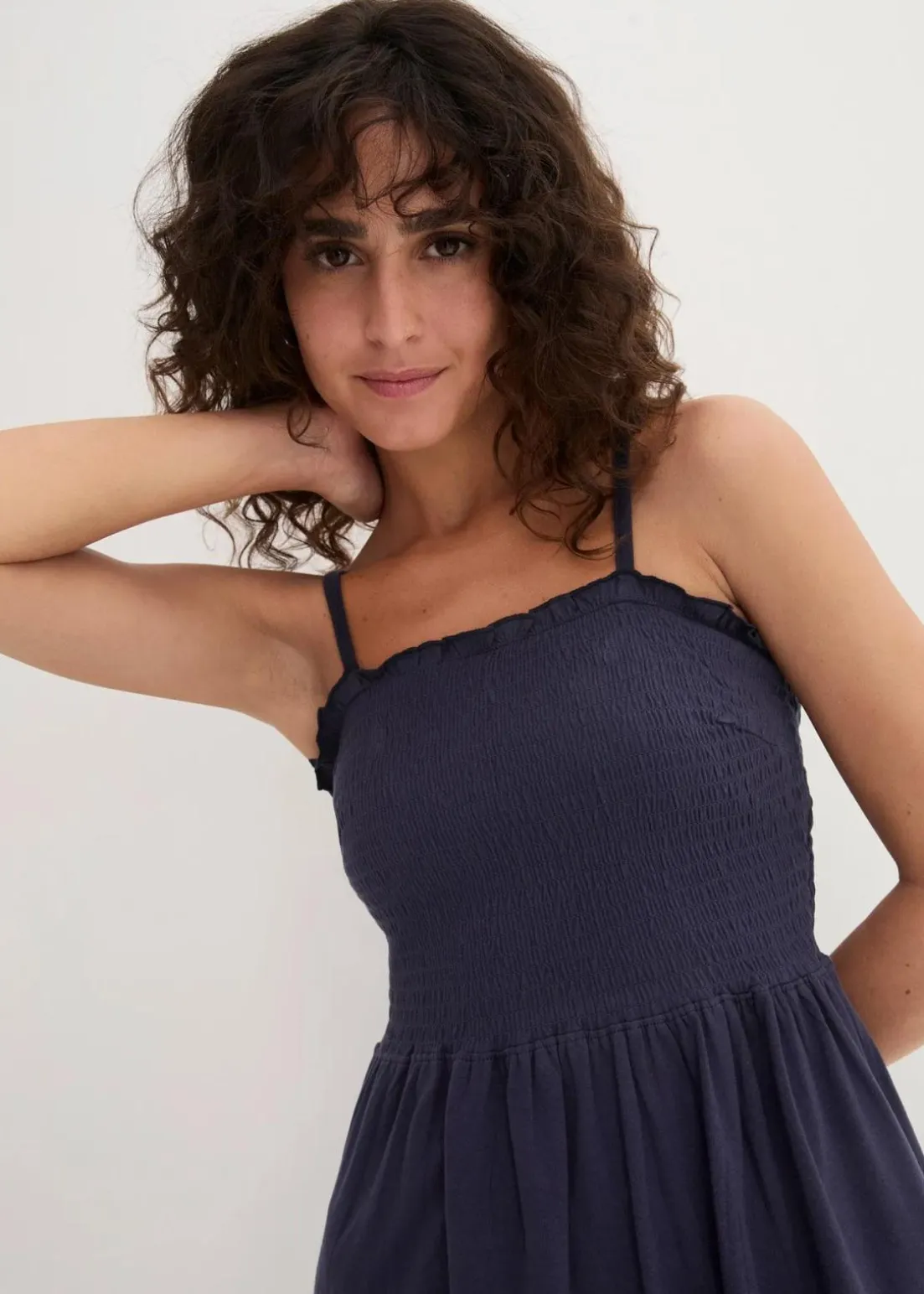 Bequemes Baummwollshirtkleid mit hübschem Smock und verstellbaren Trägern