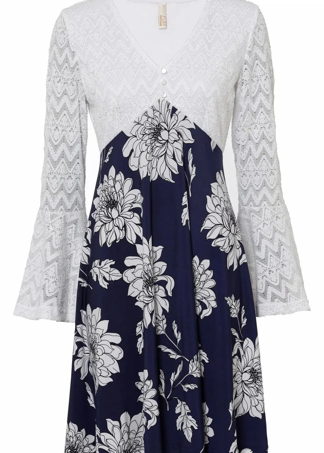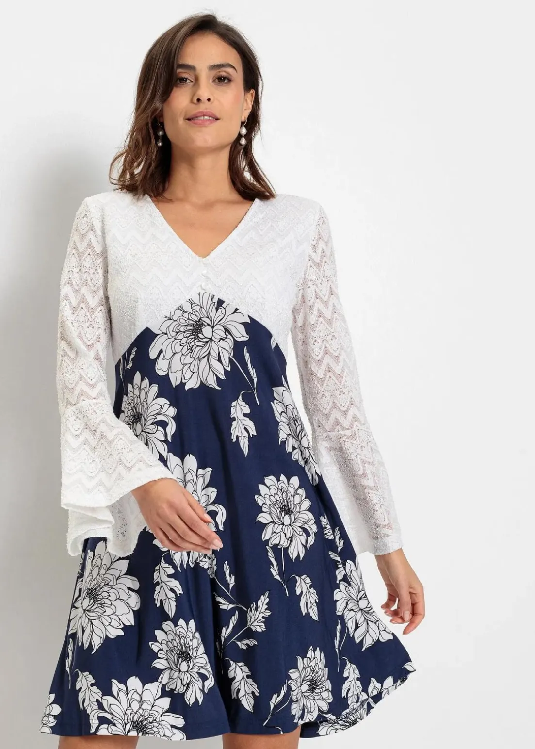 Verspielt und Feminin: Boho-Kleid mit Spitzen-Einsatz im Oberteil und Jersey-Rock, mit seinem Allover-Druck macht es jedes Teil zu einem Unikat.