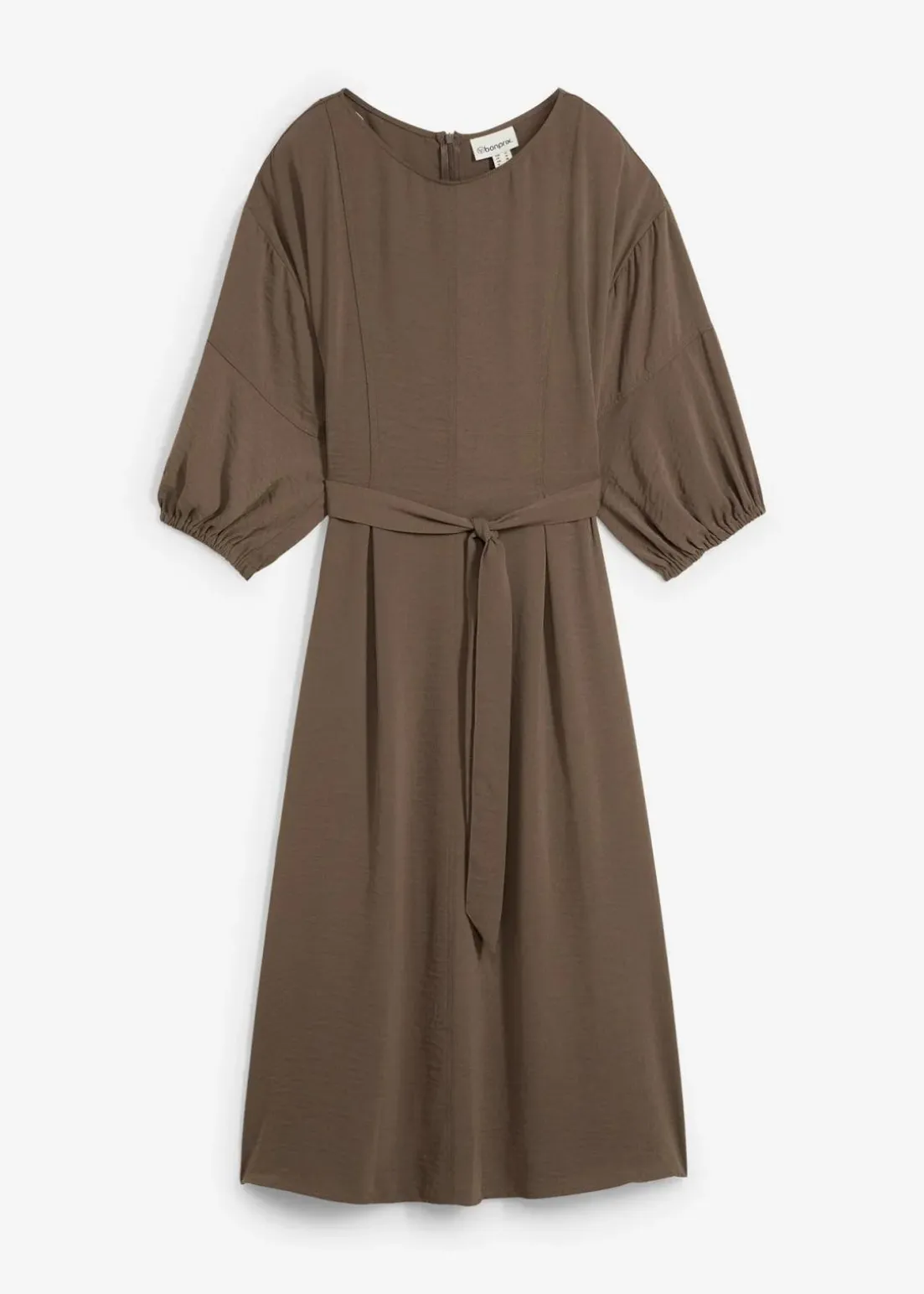 Midi-Kleid aus Webstoff mit rundem Ausschnitt und verlängerten kurzen Ärmeln mit Gummizug. In der Taille ein abnehmbarer Gürtel sowie ein verdeckter Reißverschluss hinten