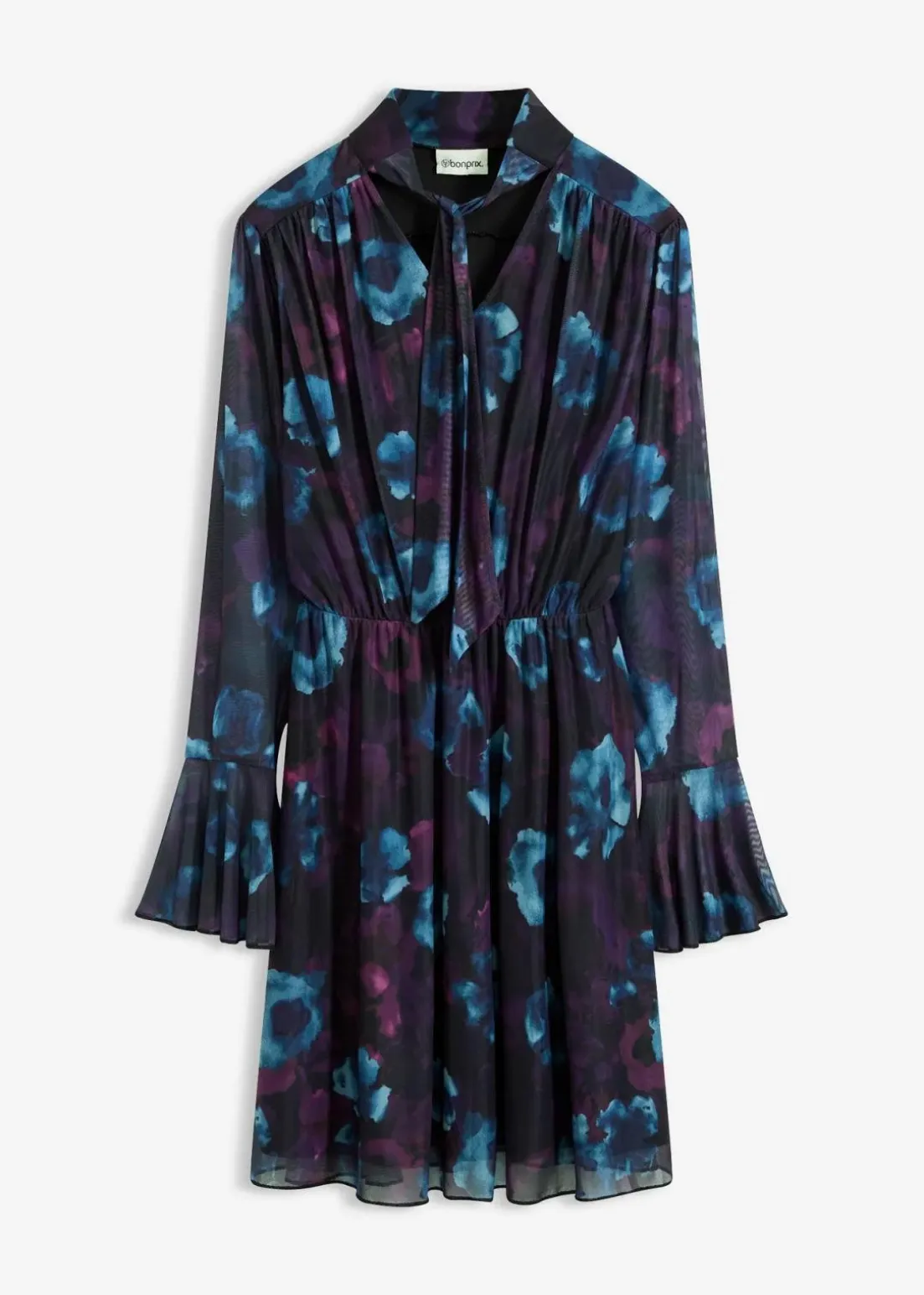 bedrucktes Kleid aus softem Mesh mit Schluppenkragen vorne und Volants am Ärmelsaum