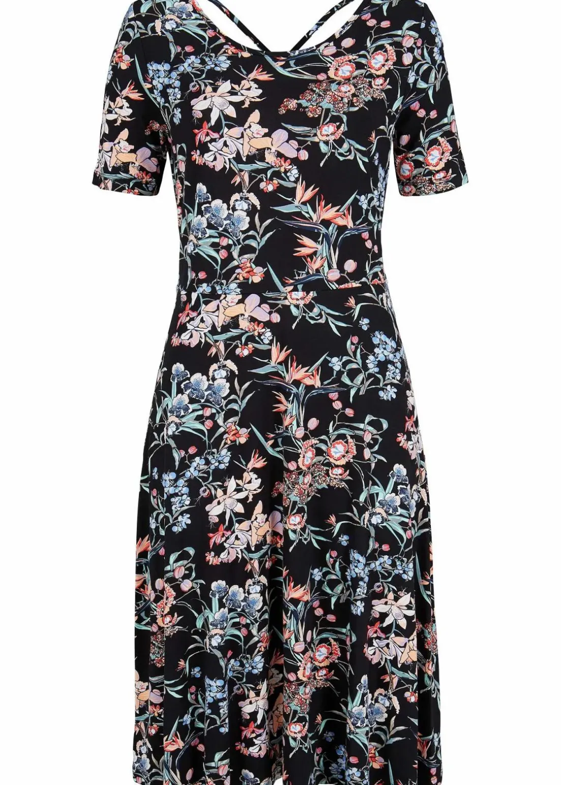 Figurschmeichelndes Jerseykleid im A-Linien-Schnitt mit überkreuzten Bändern am Rückenausschnitt