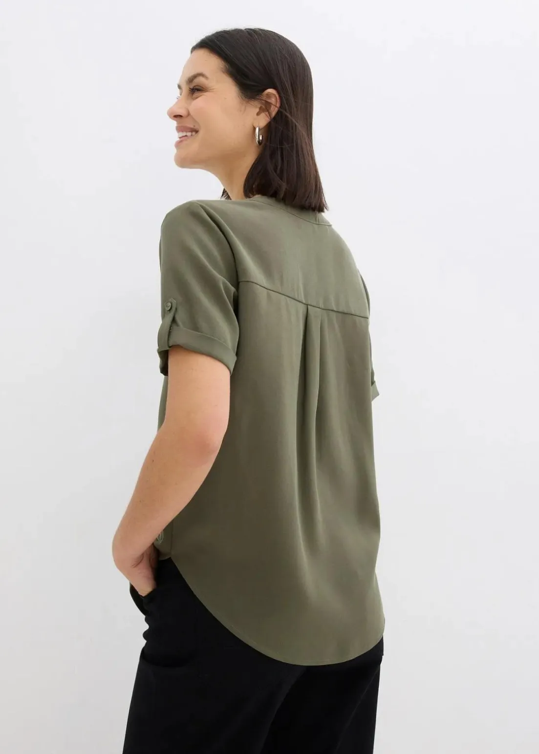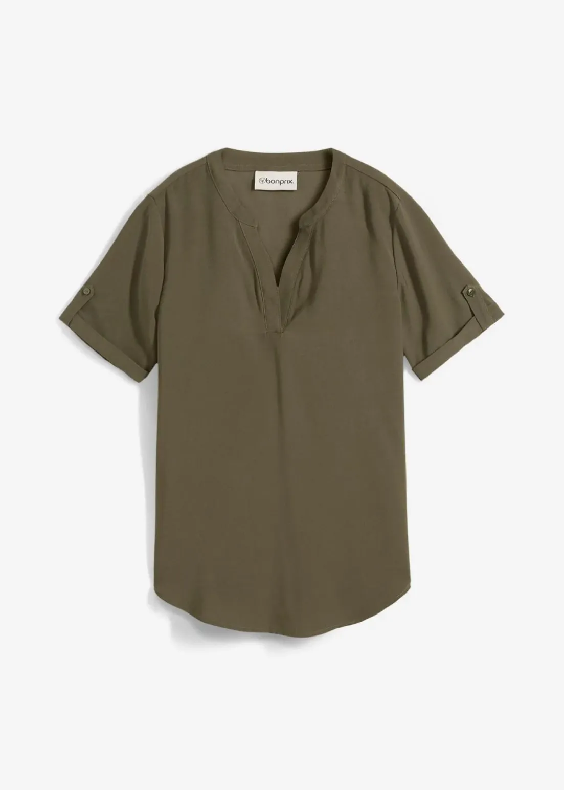 Bluse mit lässigem V-Ausschnitt und nach oben gebundenen Ärmeln