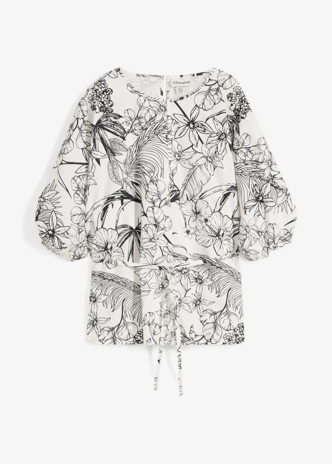 Kurzarmbluse mit rundem Ausschnitt und kurze Ärmel mit elastischem Bündchen. Bindegürtel in der Taille und Knopfverschluss am Rücken.
