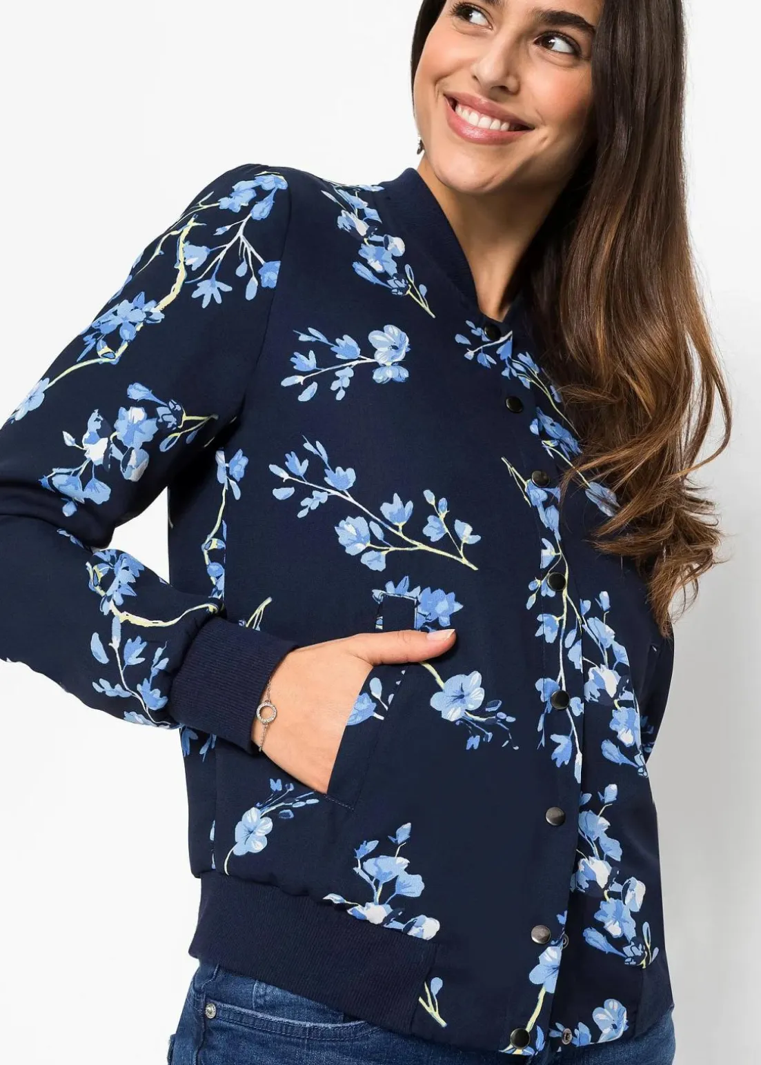 Mit diesem kurzen Blouson von BODYFLIRT betonen Frauen ihren femininen Look. Die langärmlige Jacke ist gerade geschnitten und schließt auf der Vorderseite mit einer durchgehenden Knopfleiste aus Druckknöpfen. Der kleine Kragen mit V-Ausschnitt, die Ärmel und der Saum sind mit weicher Rippware abgesetzt.Am besten passt dieser modische Blouson zu kurzen Röcken oder langen Hosen.