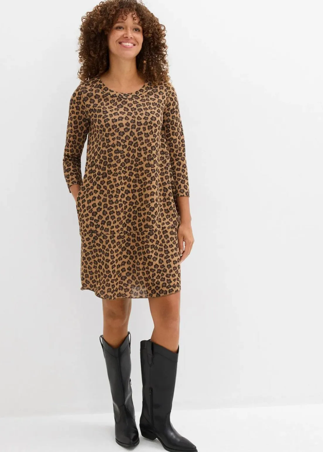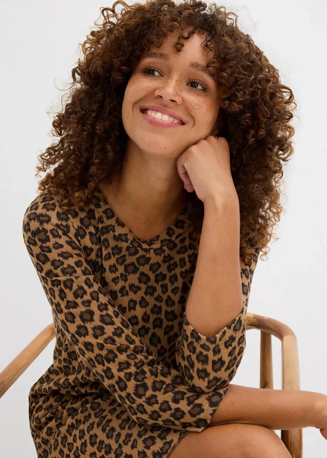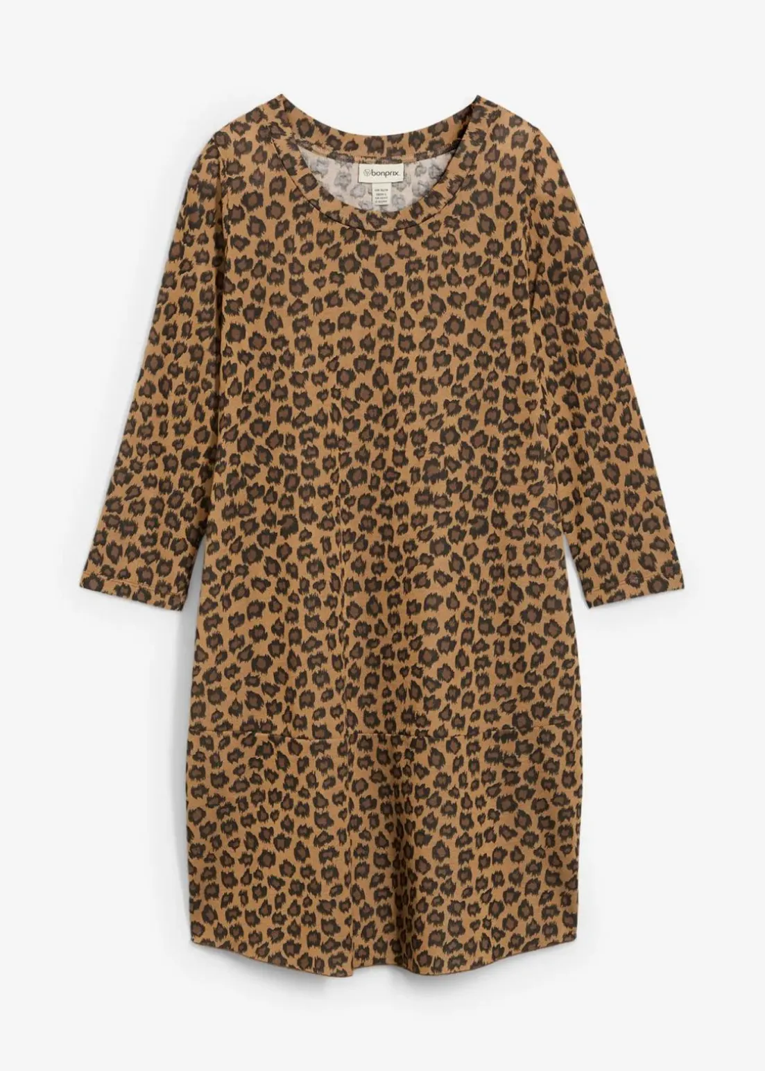 Trendiges Shirtkleid in Strickoptik mit Druck und 3/4 Ärmeln