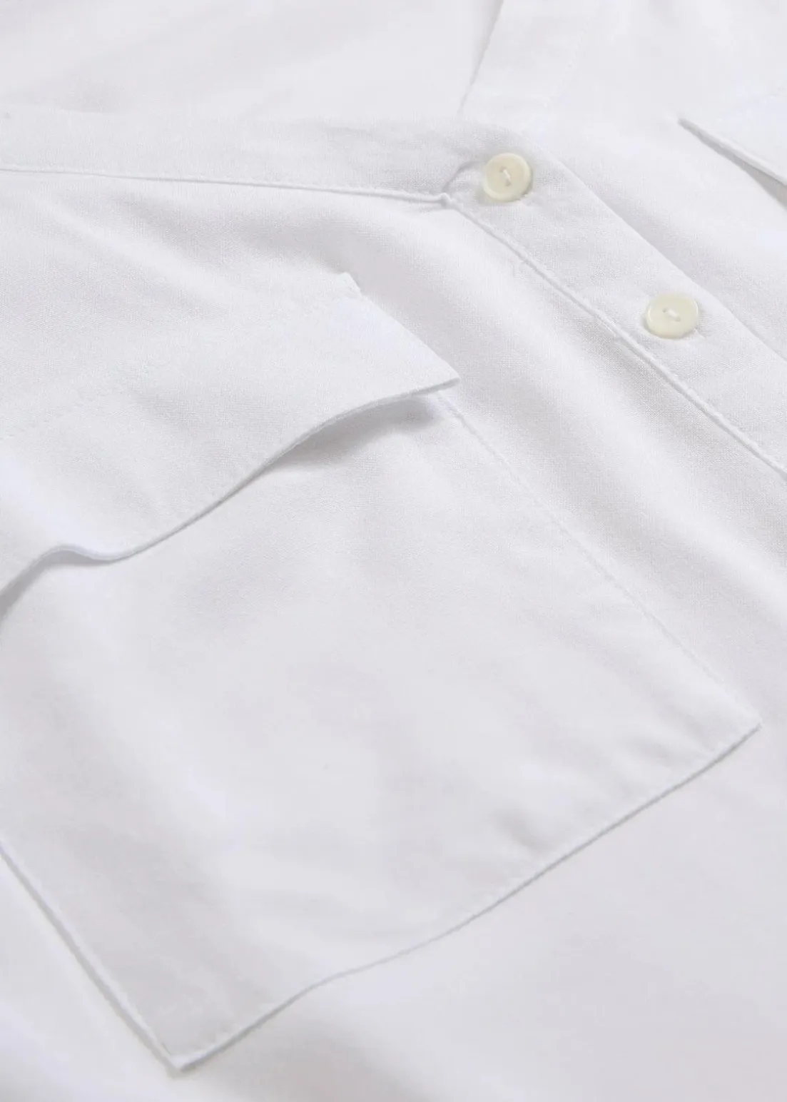 Kaschierende Langarm-Viskose-Bluse. Die Ärmel lassen sich umschlagen und mit einem Riegel mit Knopf schließen.