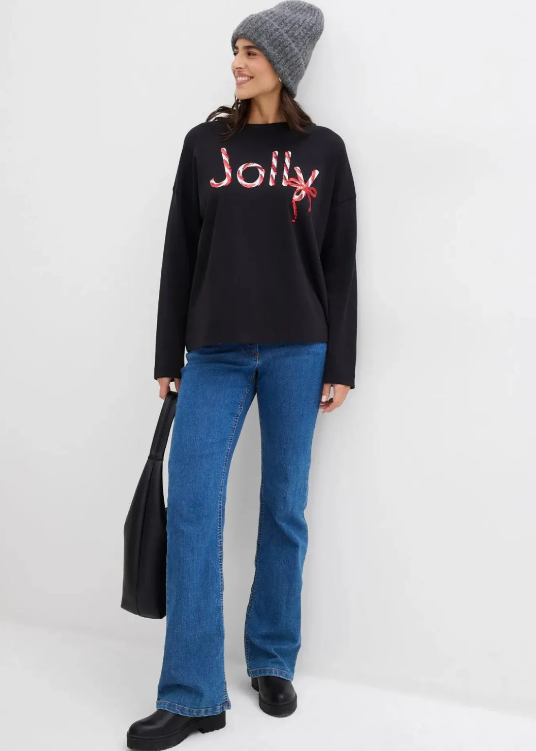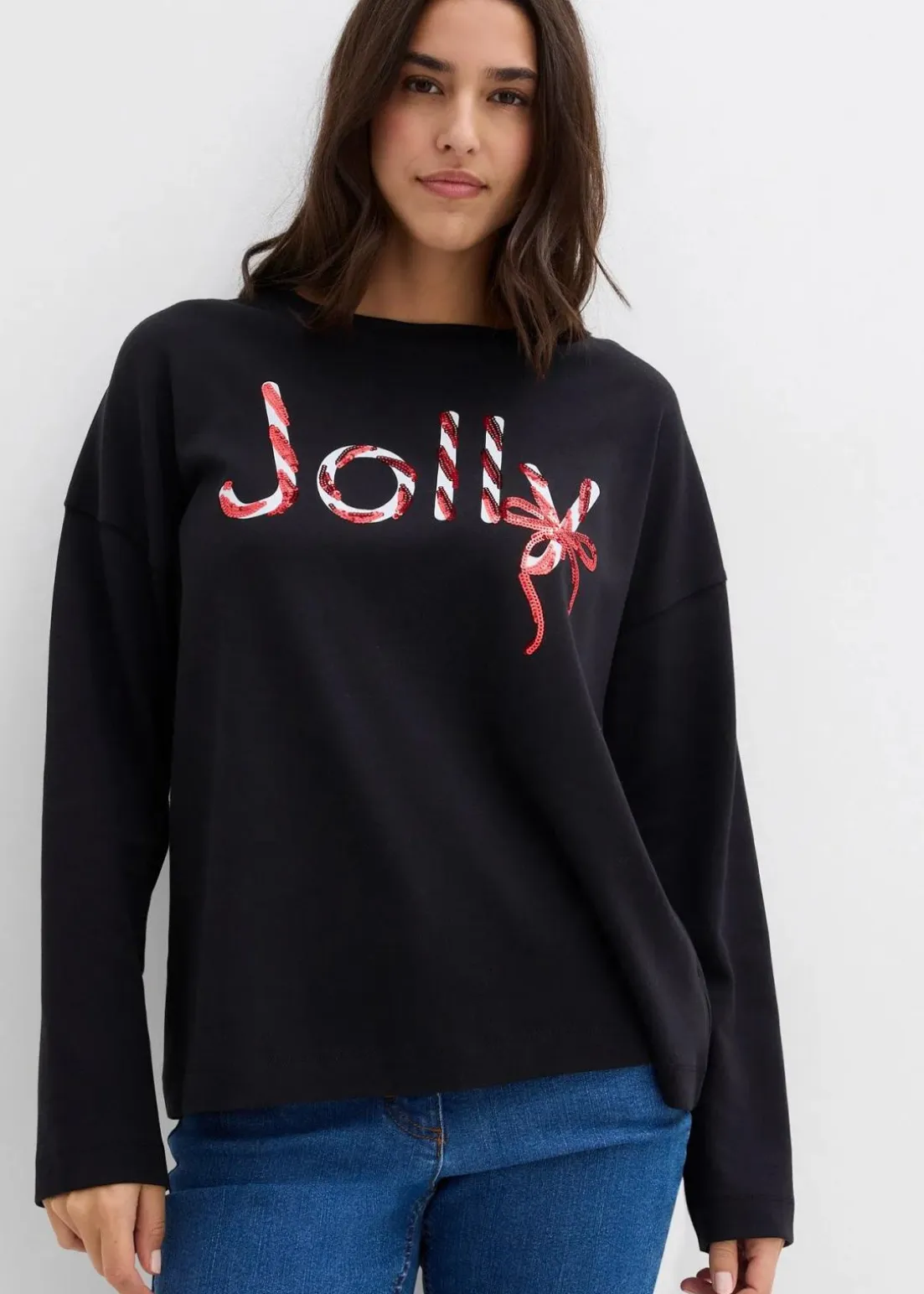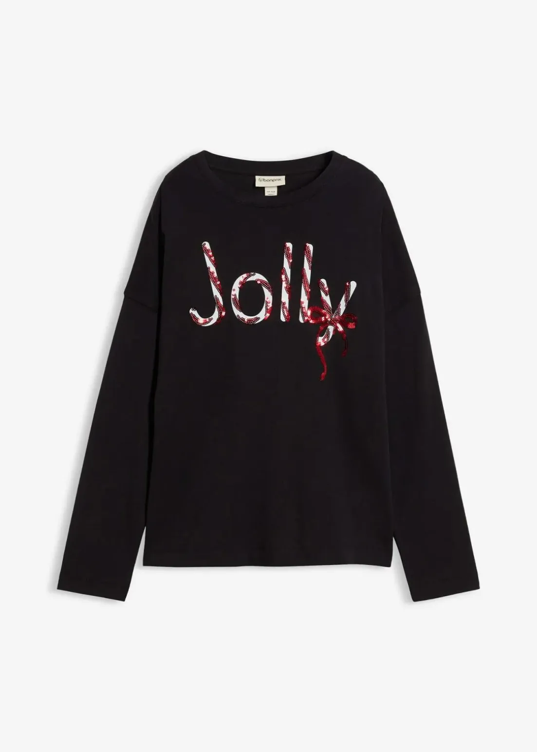 Weihnachtliches Baumwoll-Longsleeve mit Rundhals-Ausschnitt und Pailletten Schriftzug