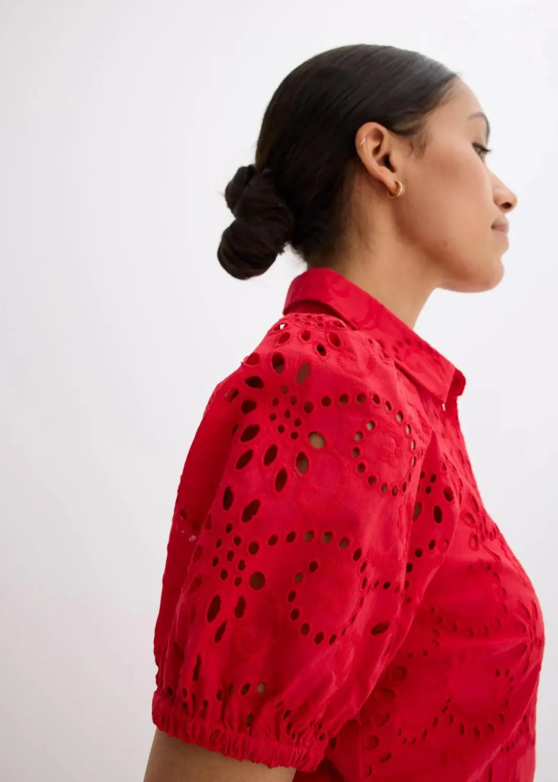 feminines lochstickerei-Blusenkleid aus reiner Baumwolle mit Bindeband in der Taille und Puffärmeln