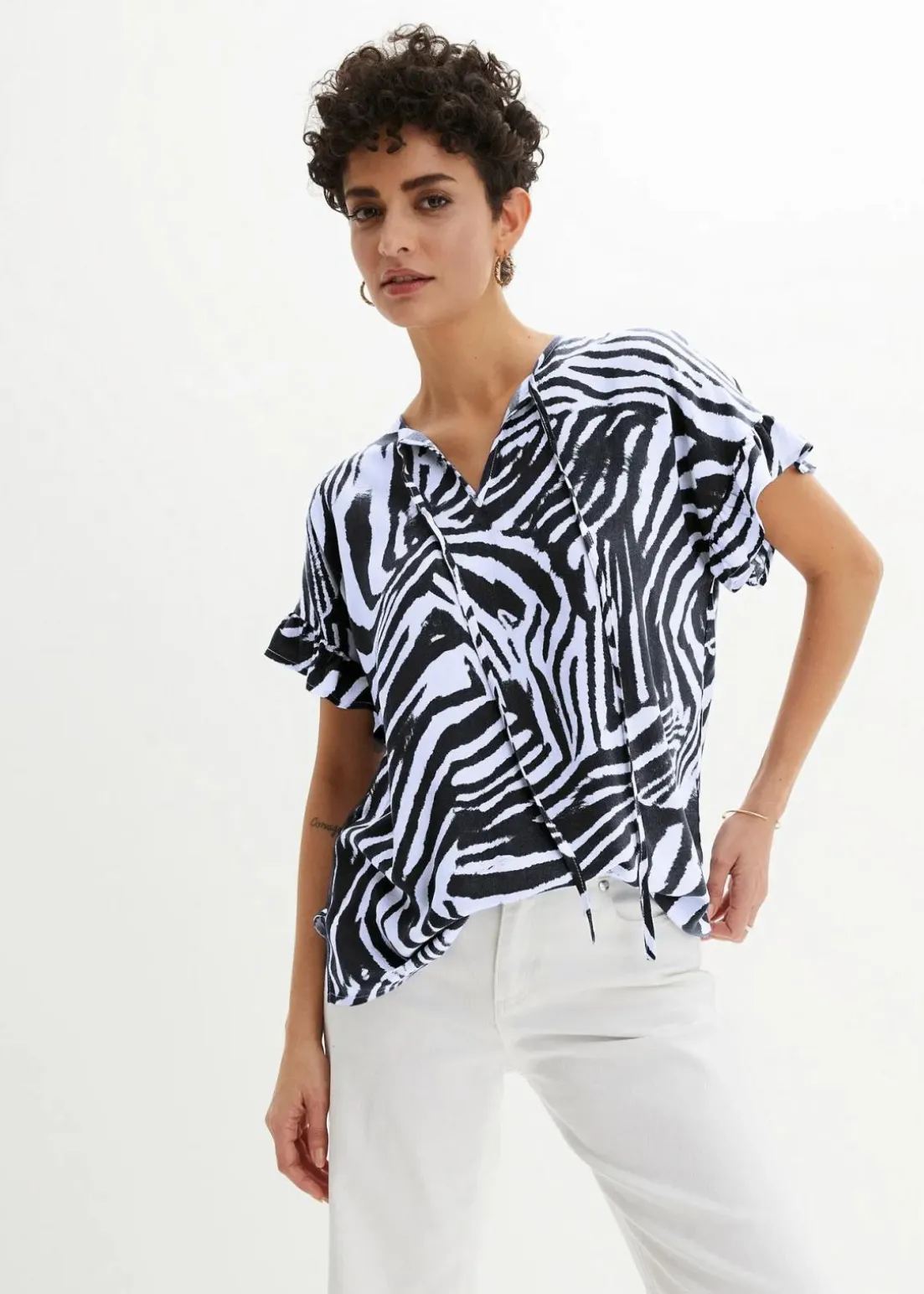Hübsche weite Tunikabluse gemustert mit Bindebändern am Ausschnitt.