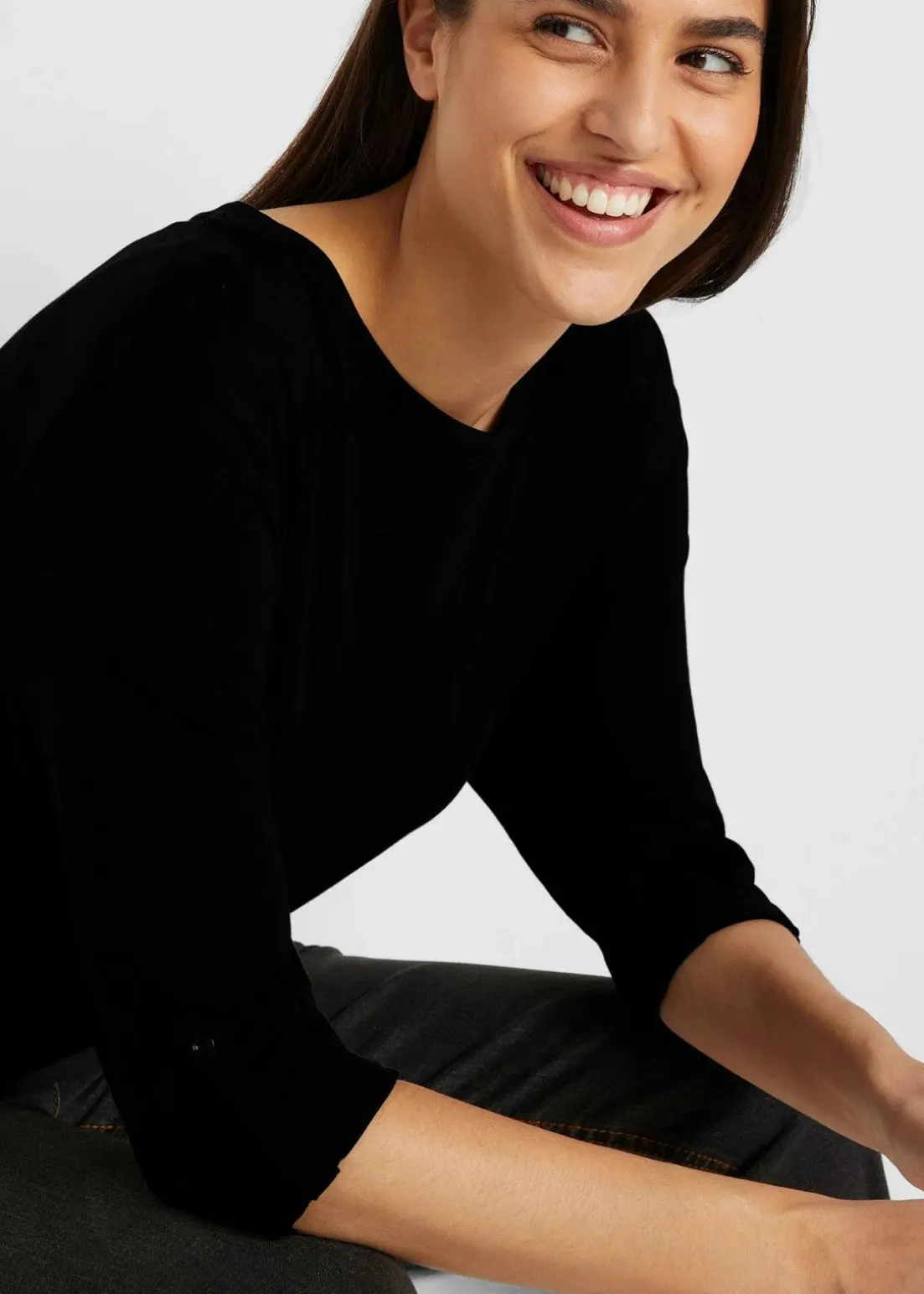 Weites Langarm-Longshirt mit dezente Rundhalsausschnitt, mit langen Ärmeln mit Krempelfunktion und lockerer Passform.