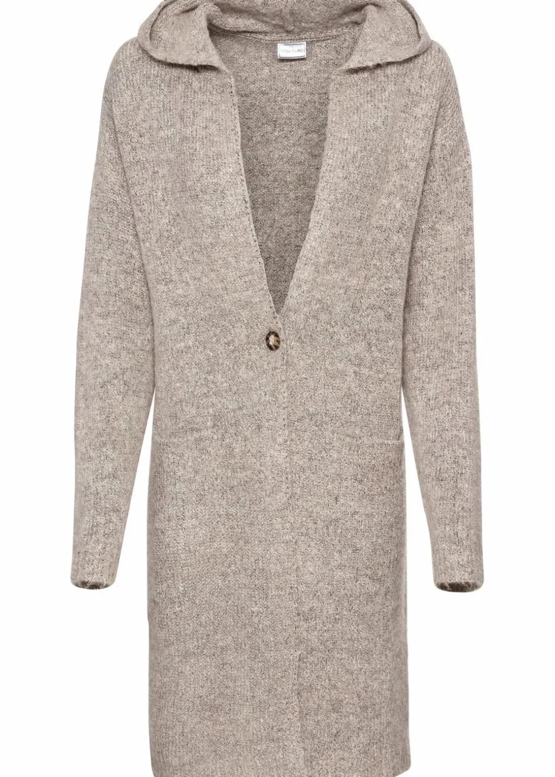 Kuschelige Longstrickjacke mit Kapuze und Knopf zum Verschließen. Länge in Gr. 36/38 ca. 90 cm.
