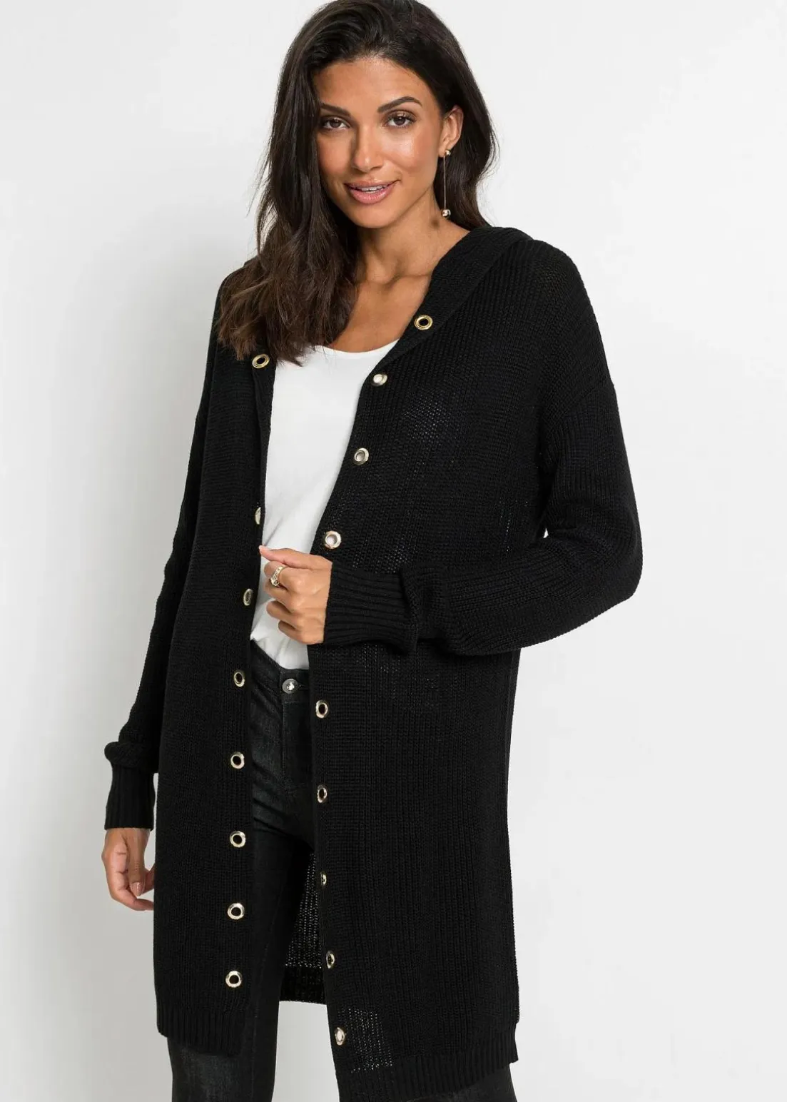 Die Longstrickjacke mit Kapuze lässt sich vielseitig zu entspannten Freizeitoutfits kombinieren.