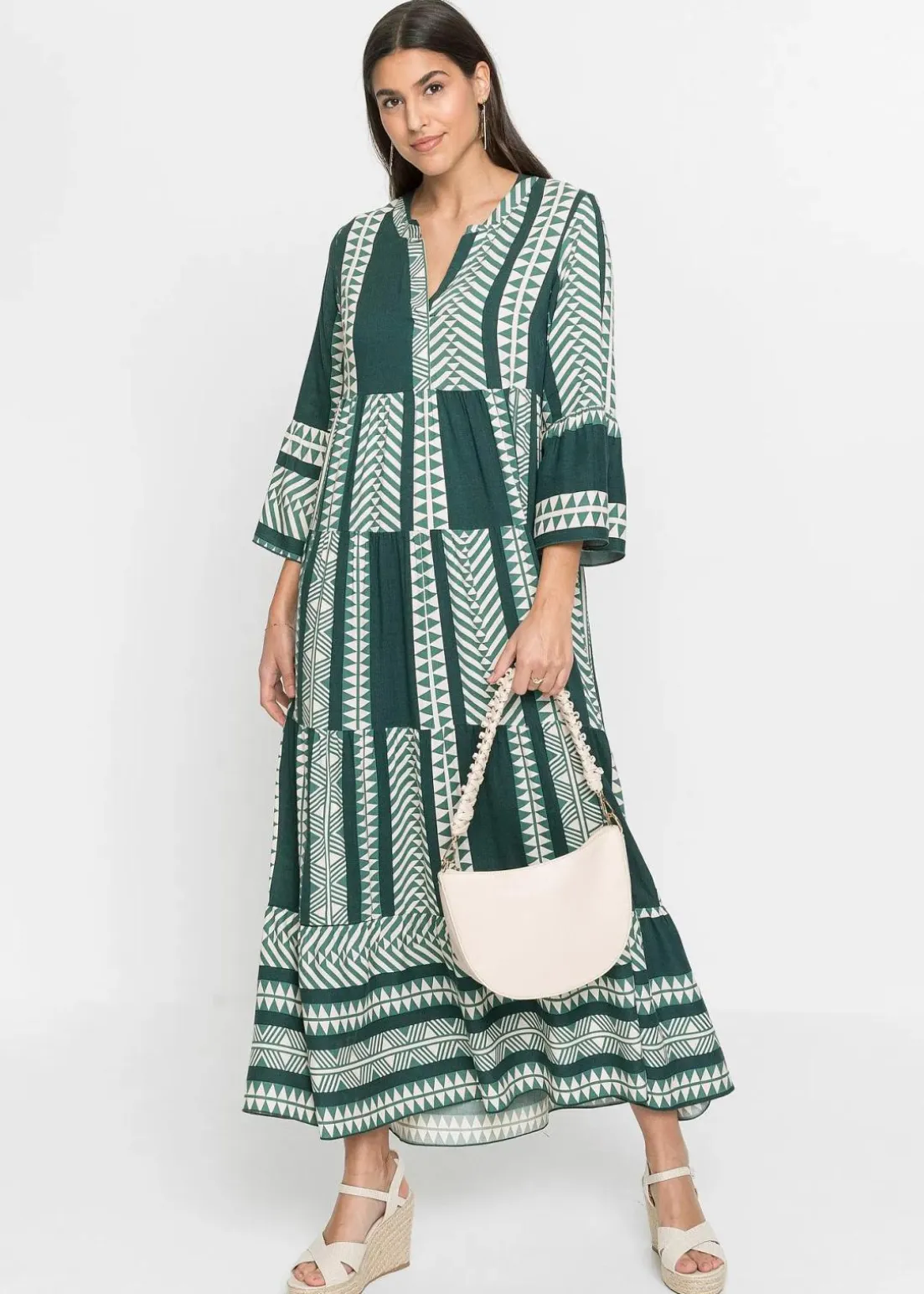 Bedrucktes Maxikleid mit Stufenrock. Länge in Größe 38 ca. 140cm.