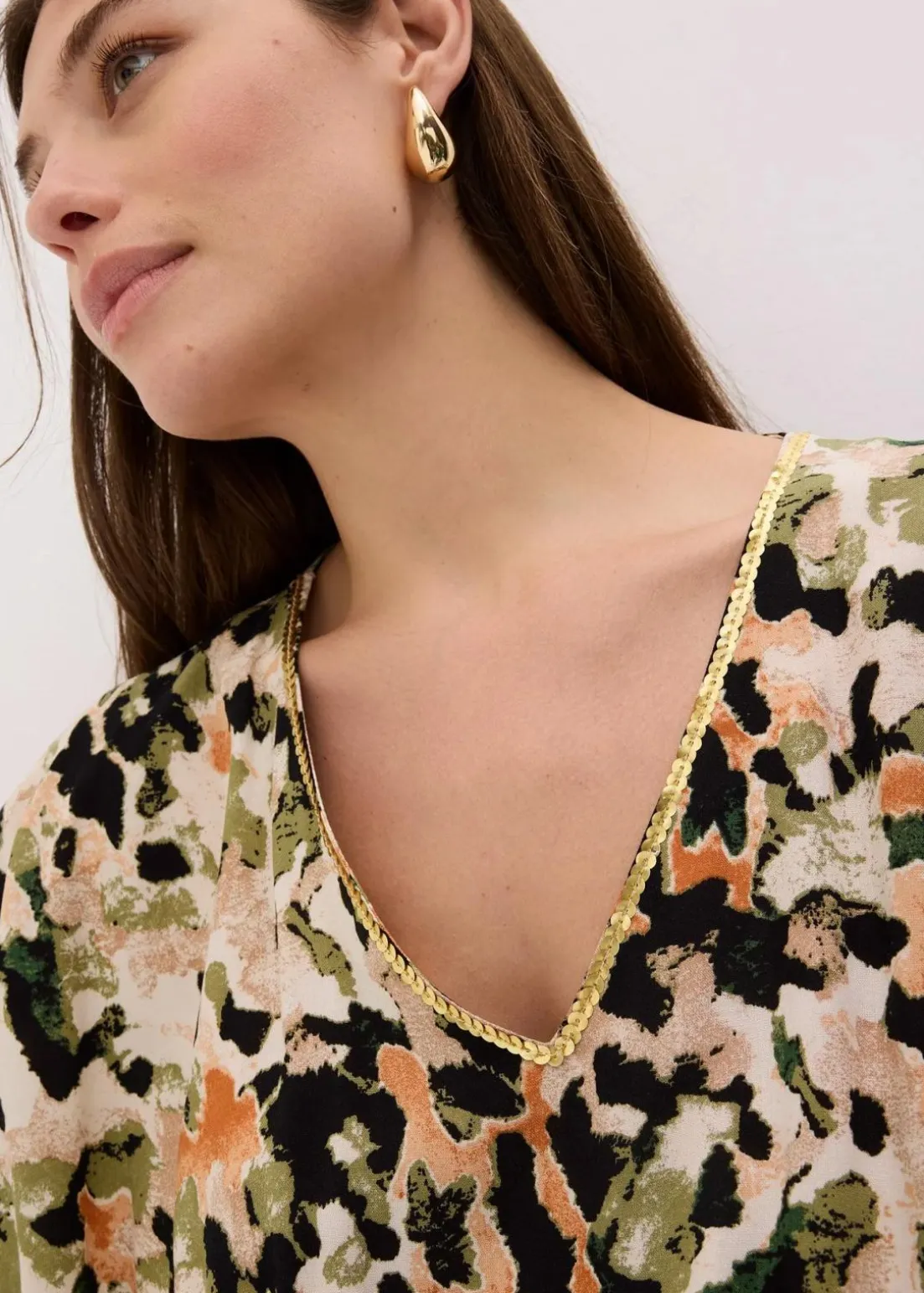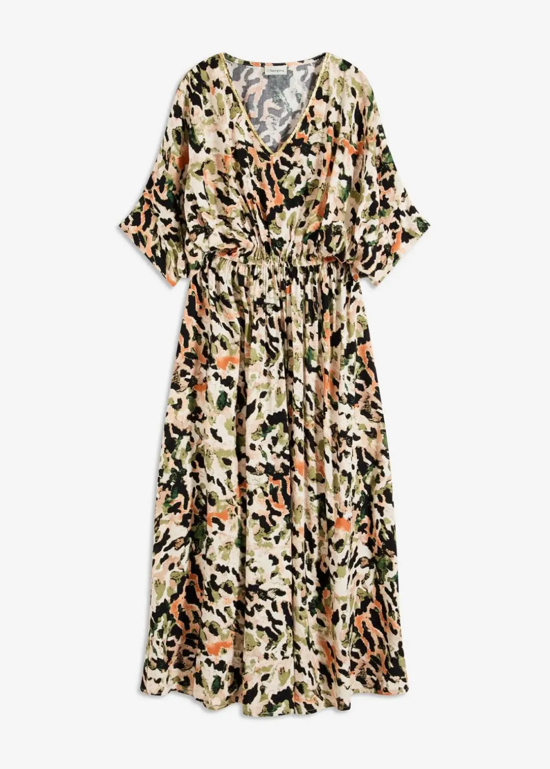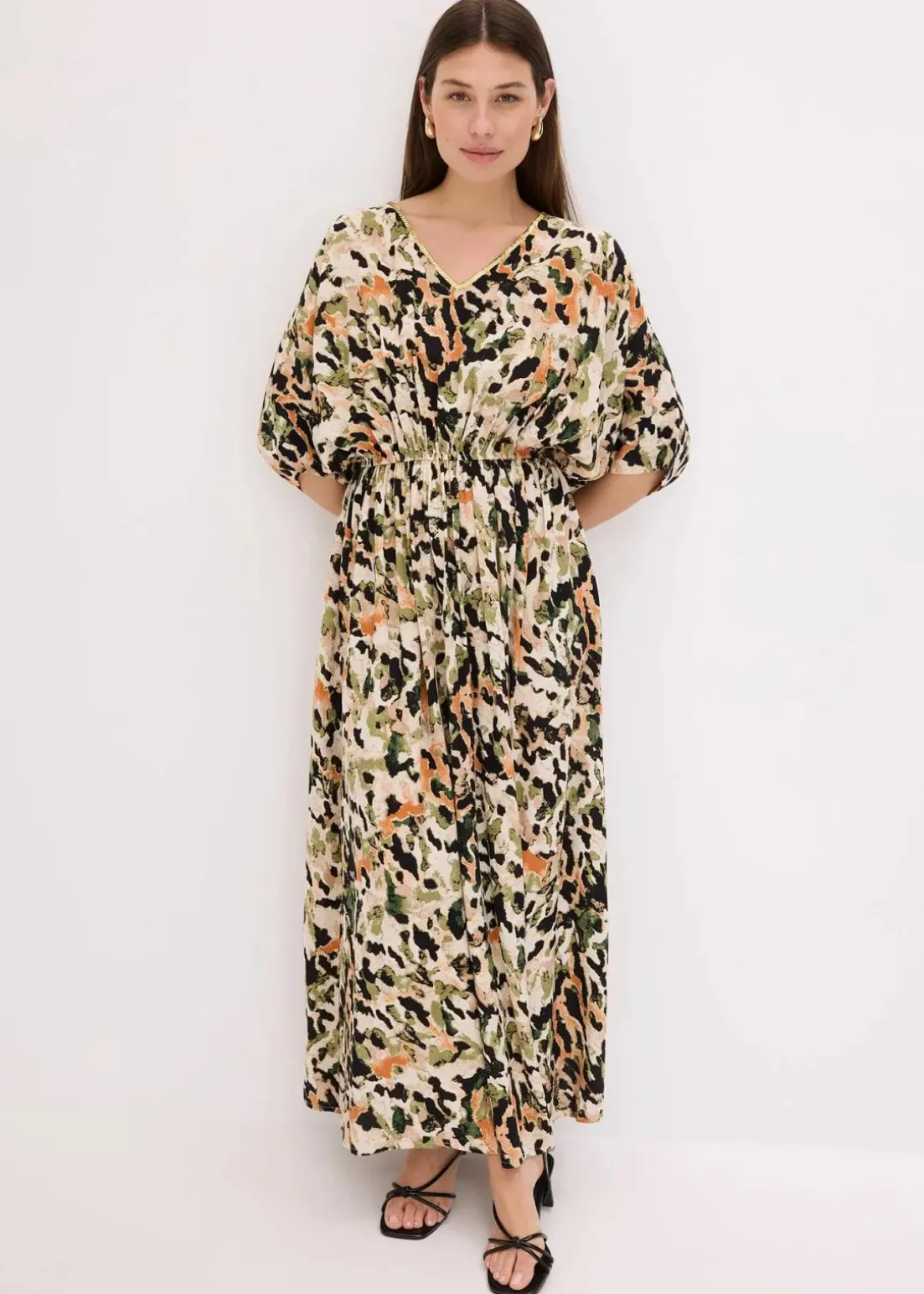 modisch bedrucktes Maxikleid aus fließender Viskose mit dekorativer Pailletten-Applikation vorne am V-Ausschnitt