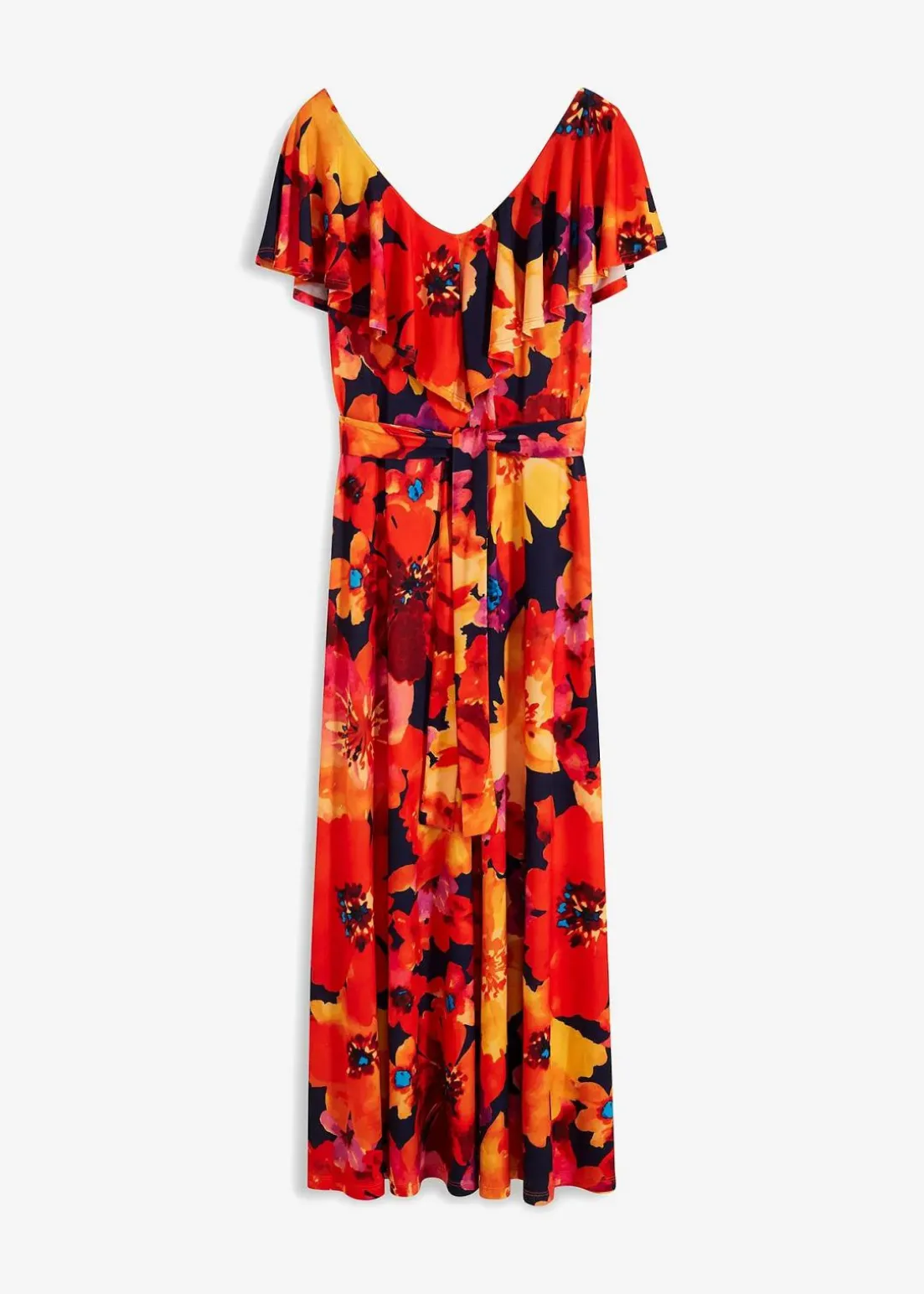 Einfach bezaubernd. Dieses wunderschöne Kleid mit Volant und Bindegürtel ist ein Must-Have für jeden Kleiderschrank. Länge in Gr. 36/38 ca. 136 cm.