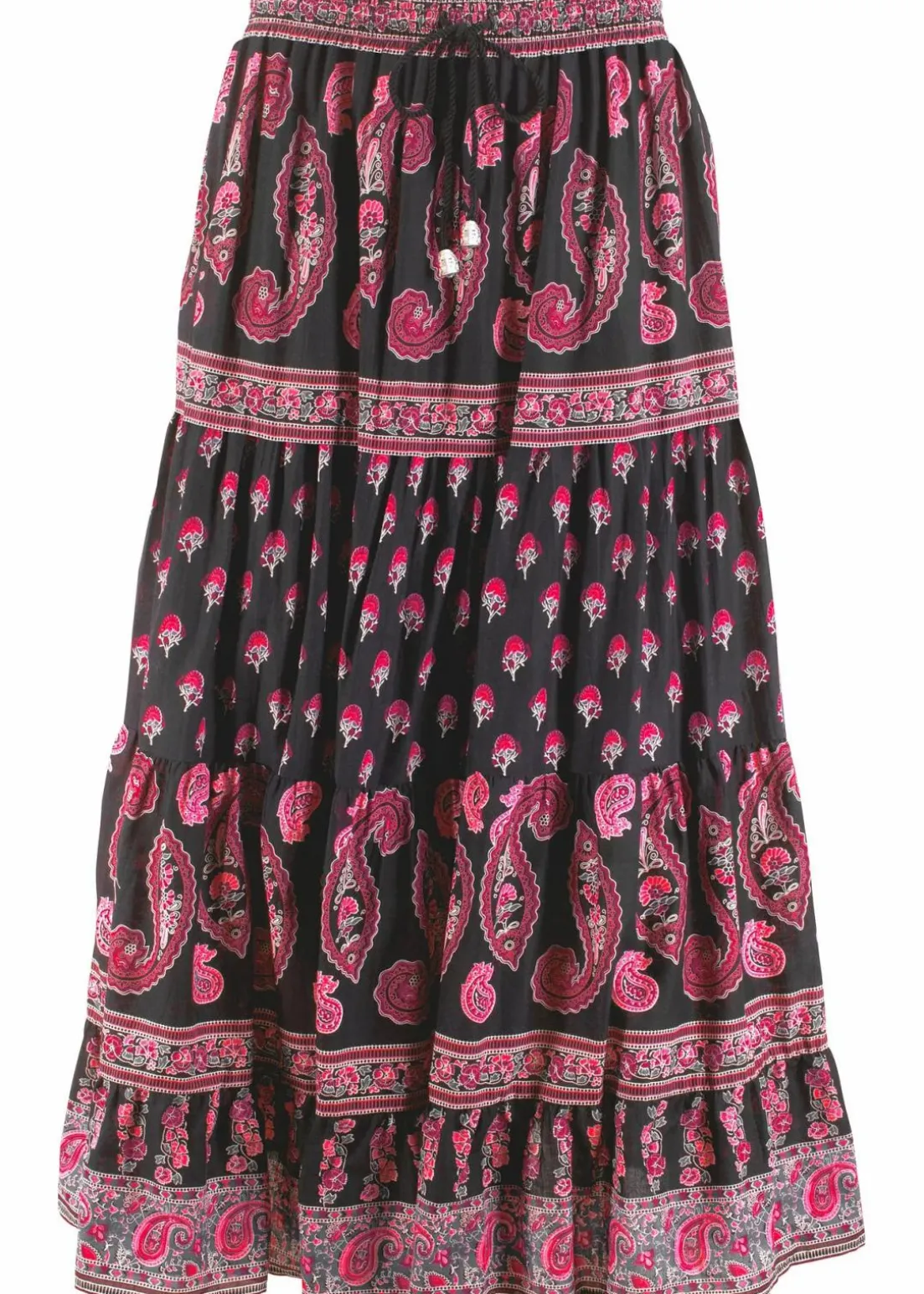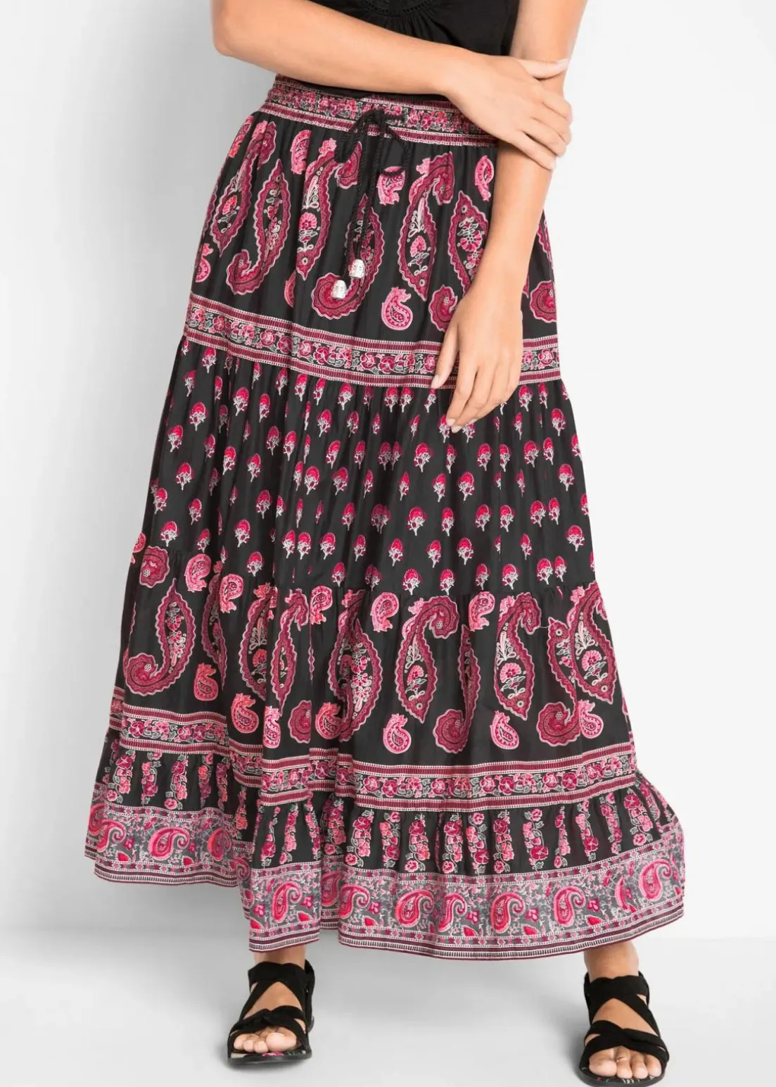 Der lange Rock der Marke bpc punktet mit seiner figurfreundlichen Passform und fällt durch seinen hübschen Druck auf. Durch seinen raffinierten Schnitt mit elastischem Gummizugbund und in Stufen genähtem Stoff wirkt der Rock optisch sehr kaschierend. Mit dem Tunnelzug mit Bindeband in der Hüfte lässt sich die Bundweite bequem regulieren.Der vorteilhaft verlängerte Rock in Baumwoll-Stretch-Qualität sieht prima aus zu einem schlichten Top. Jeder Print ist ein Unikat.