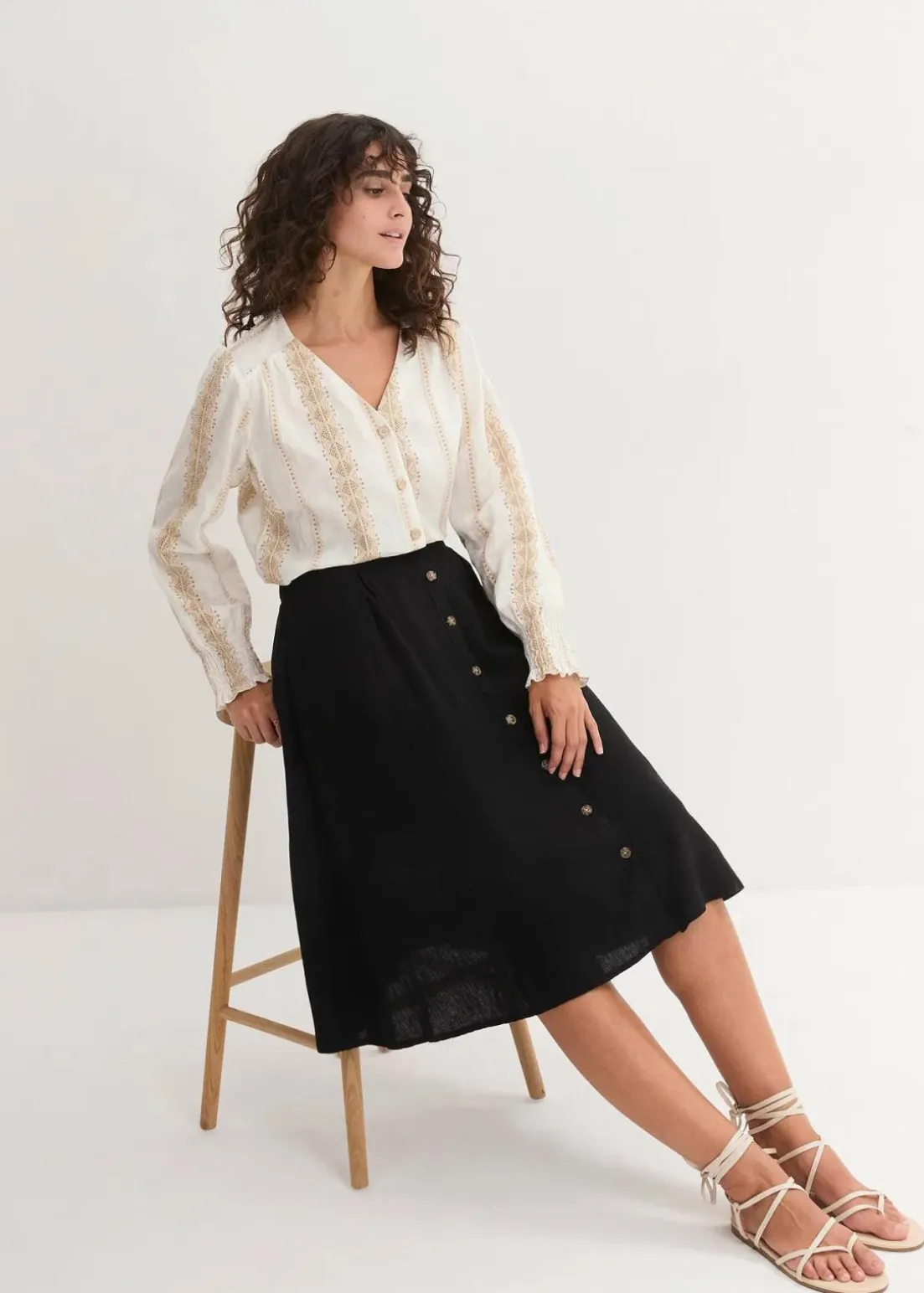Locker fallender Rock mit Knopfleiste und hinteren elastischem Bund. Die Knöpfe können Farbabweichungen durch die Hornoptik aufweisen.