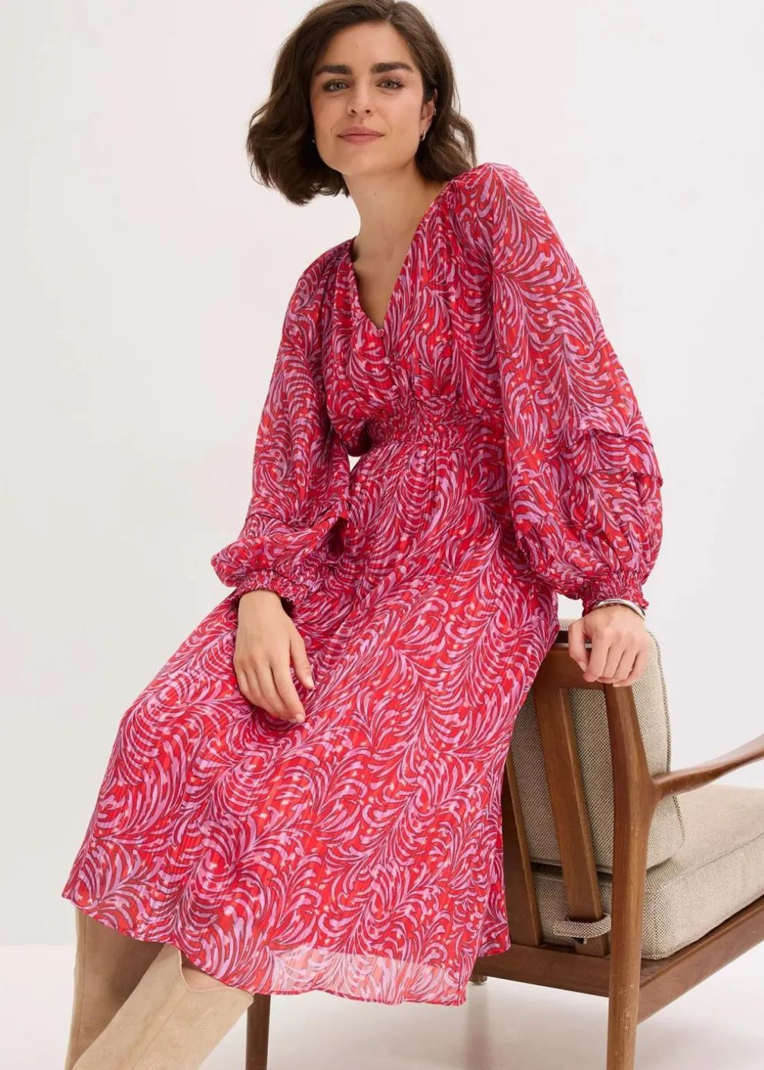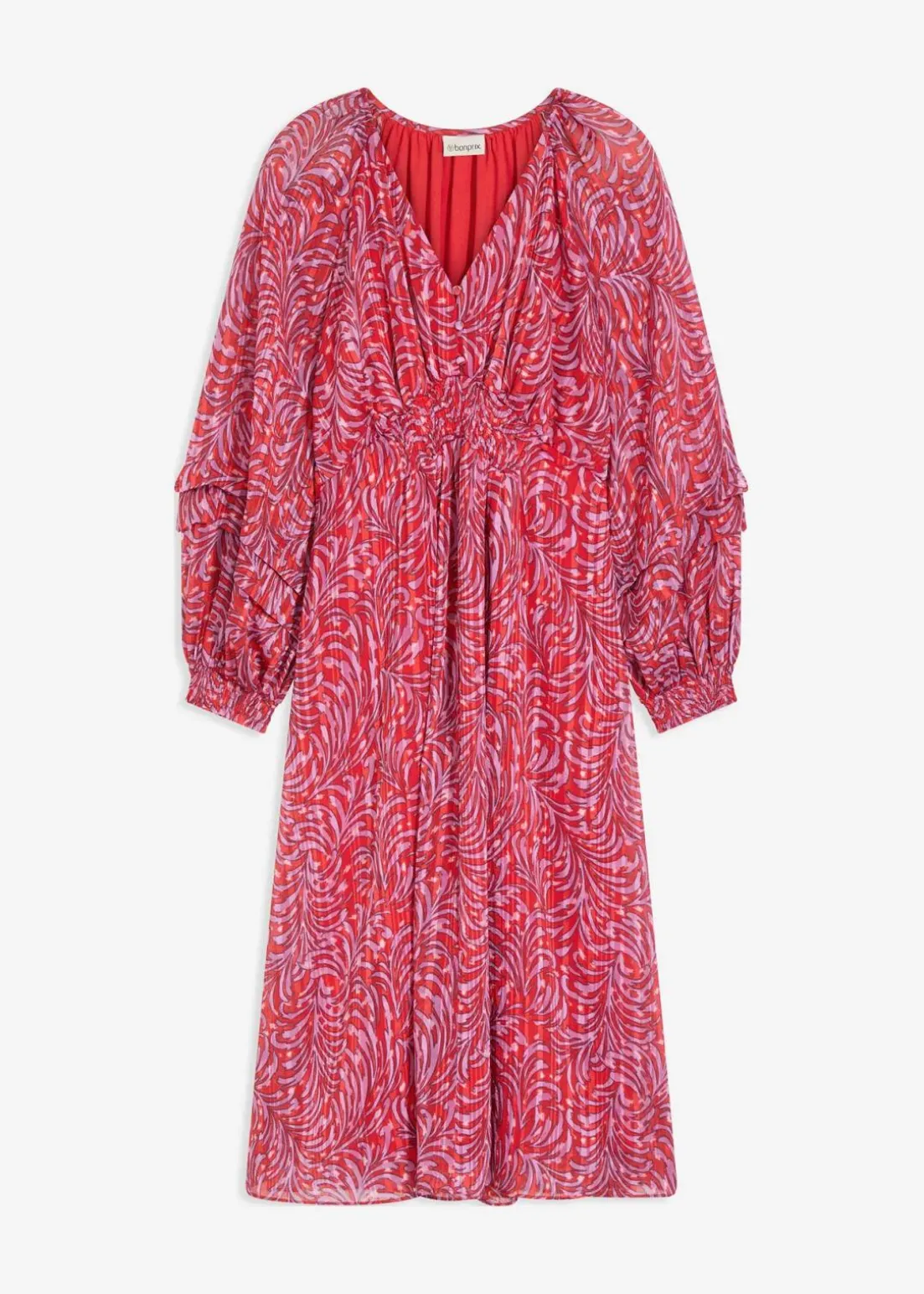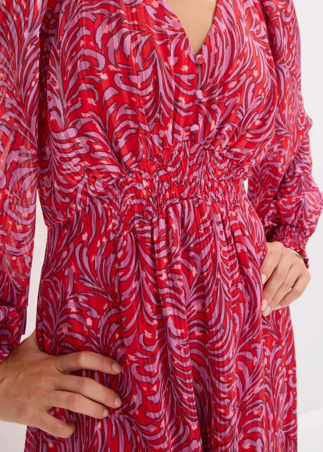 modisches Midikleid mit Smok-Detail in der Taille, weit geschnittenen Ärmeln und dekorativen Knöpfen vorne am Oberteil