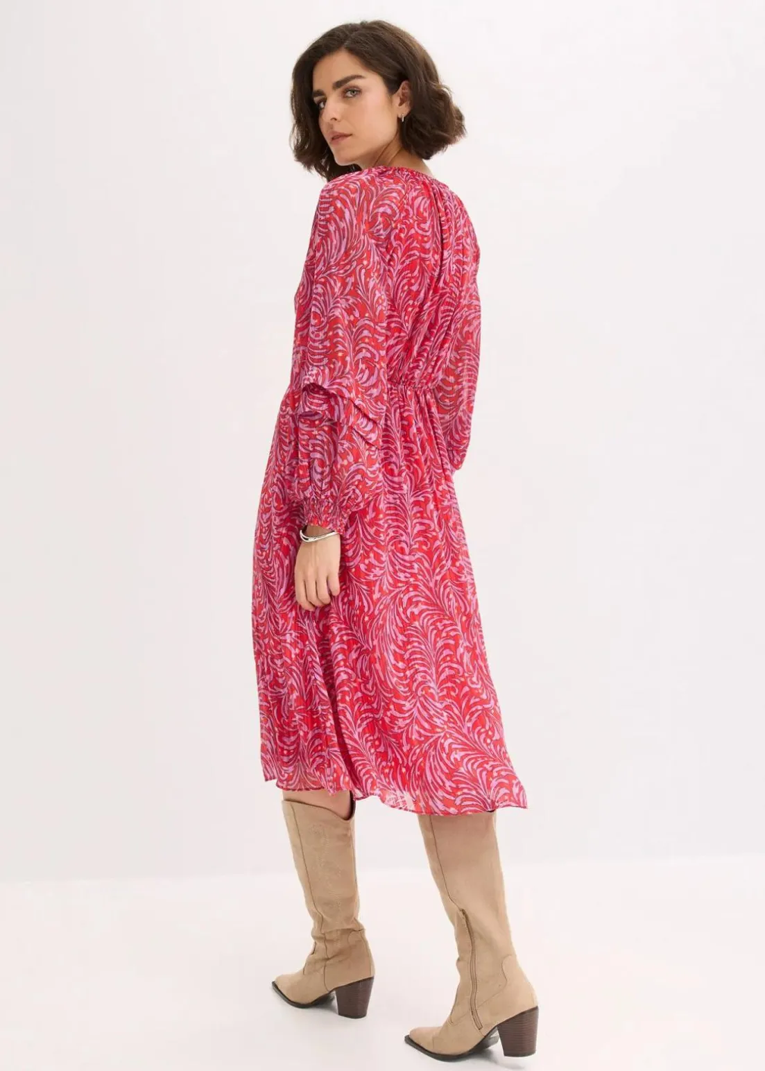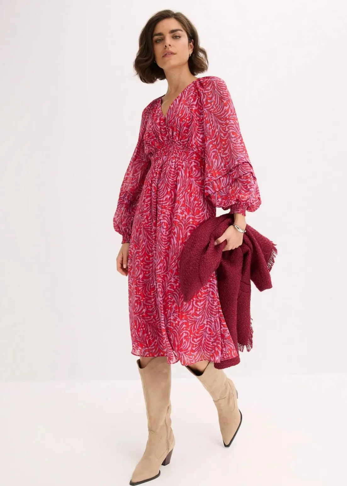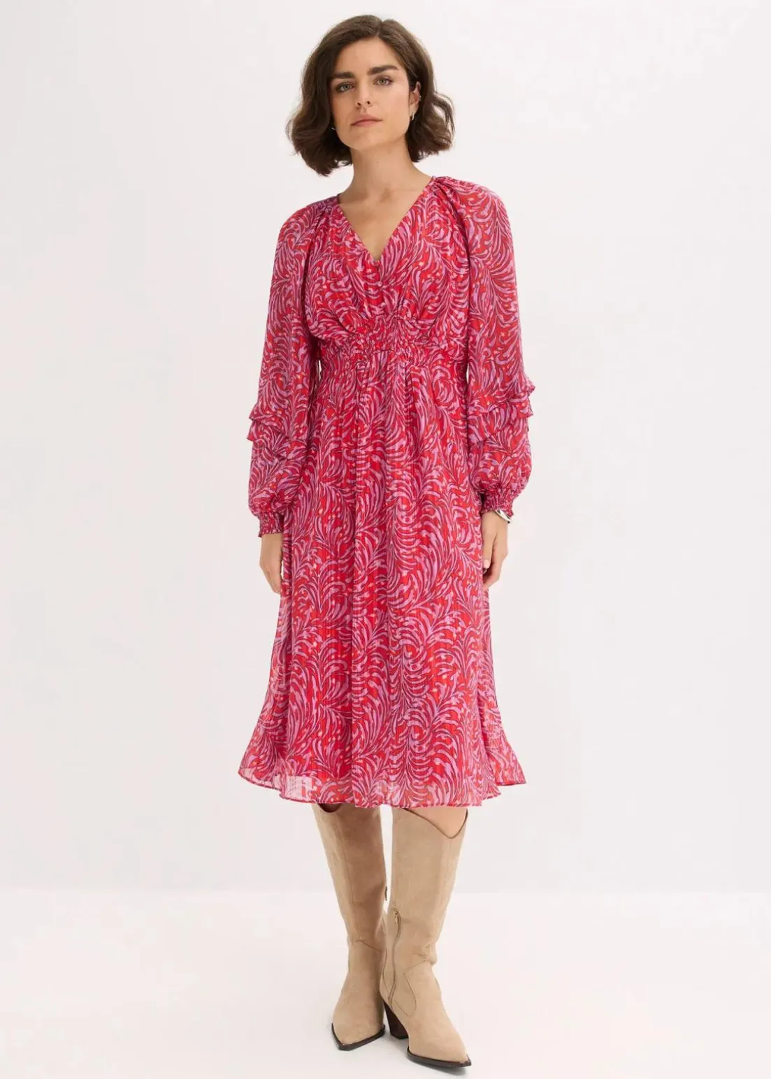 modisches Midikleid mit Smok-Detail in der Taille, weit geschnittenen Ärmeln und dekorativen Knöpfen vorne am Oberteil