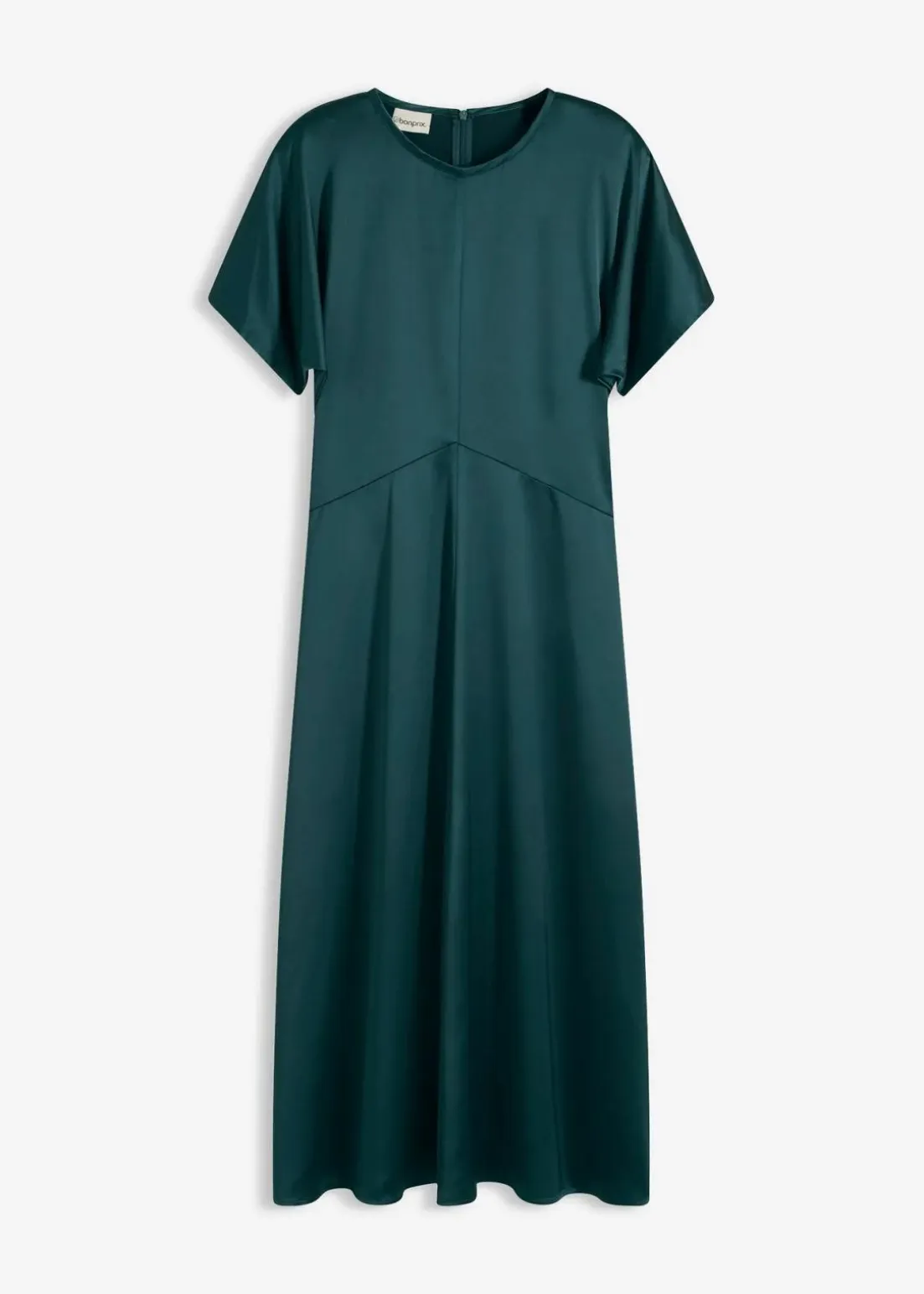 Das Midikleid aus fließendem Satin hat eine taillierte Silhouette und weite Ärmel