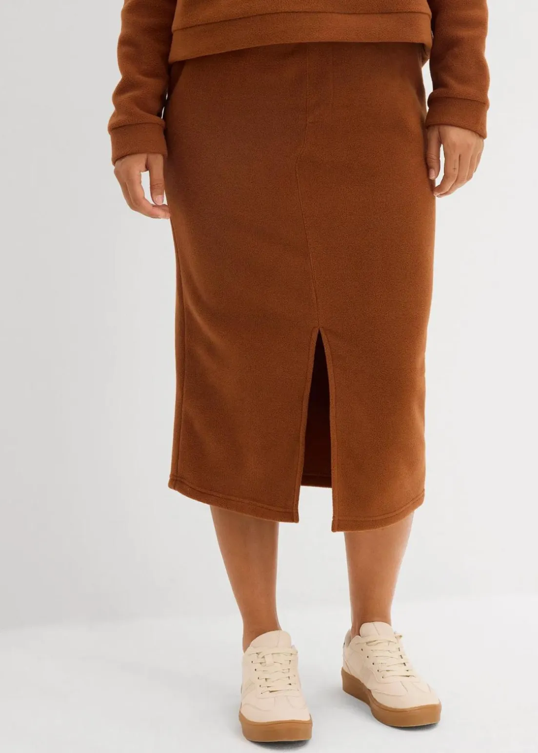 Midirock mit elastischem Bund und vorderem Beinschlitz.