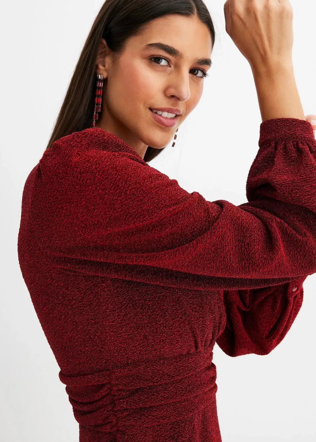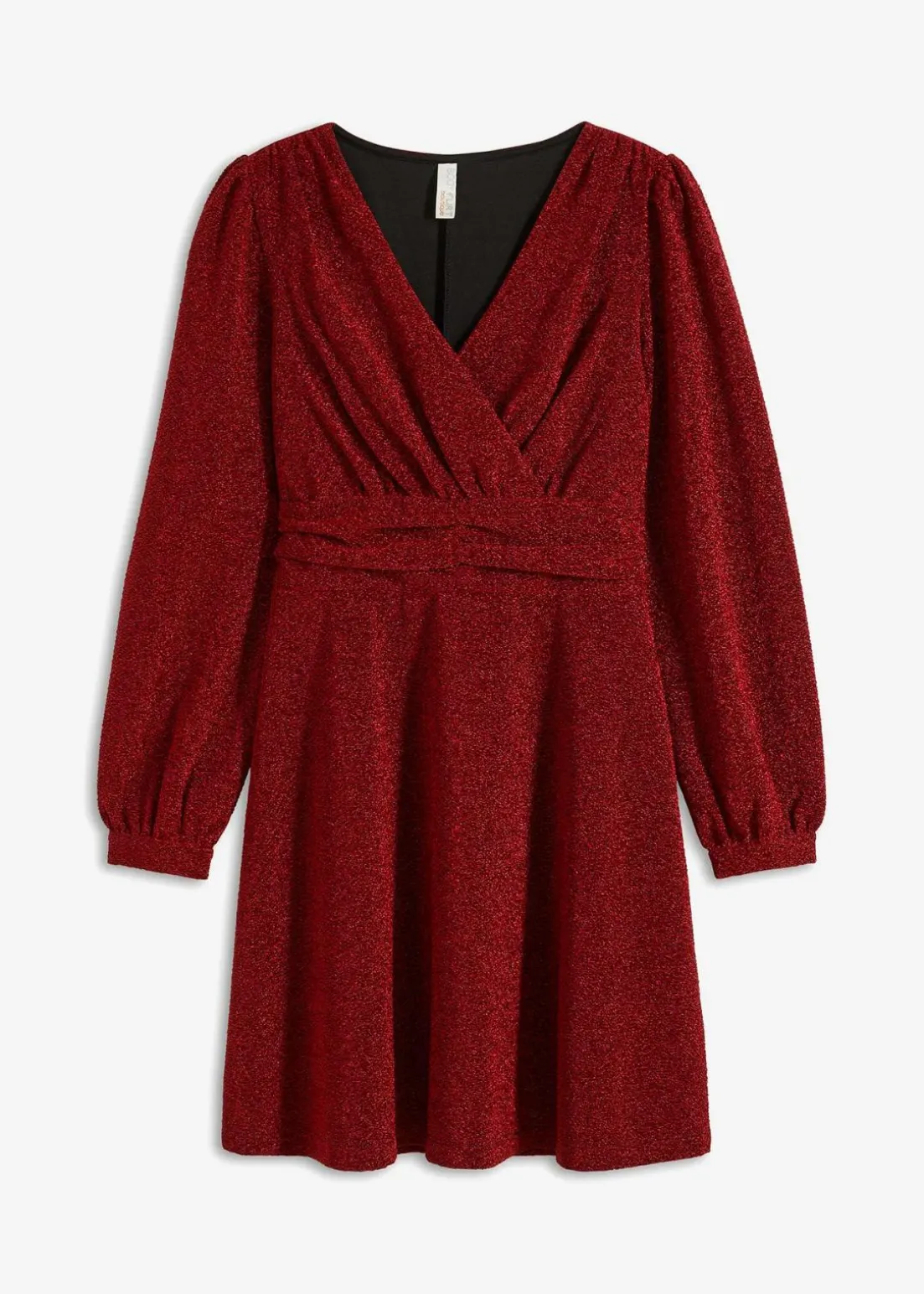 Modern und feminin: Ausgestelltes Minikleid aus glitzerndem Material in Wickel-Optik mit Ballon-Ärmel und Taillen-Einsatz