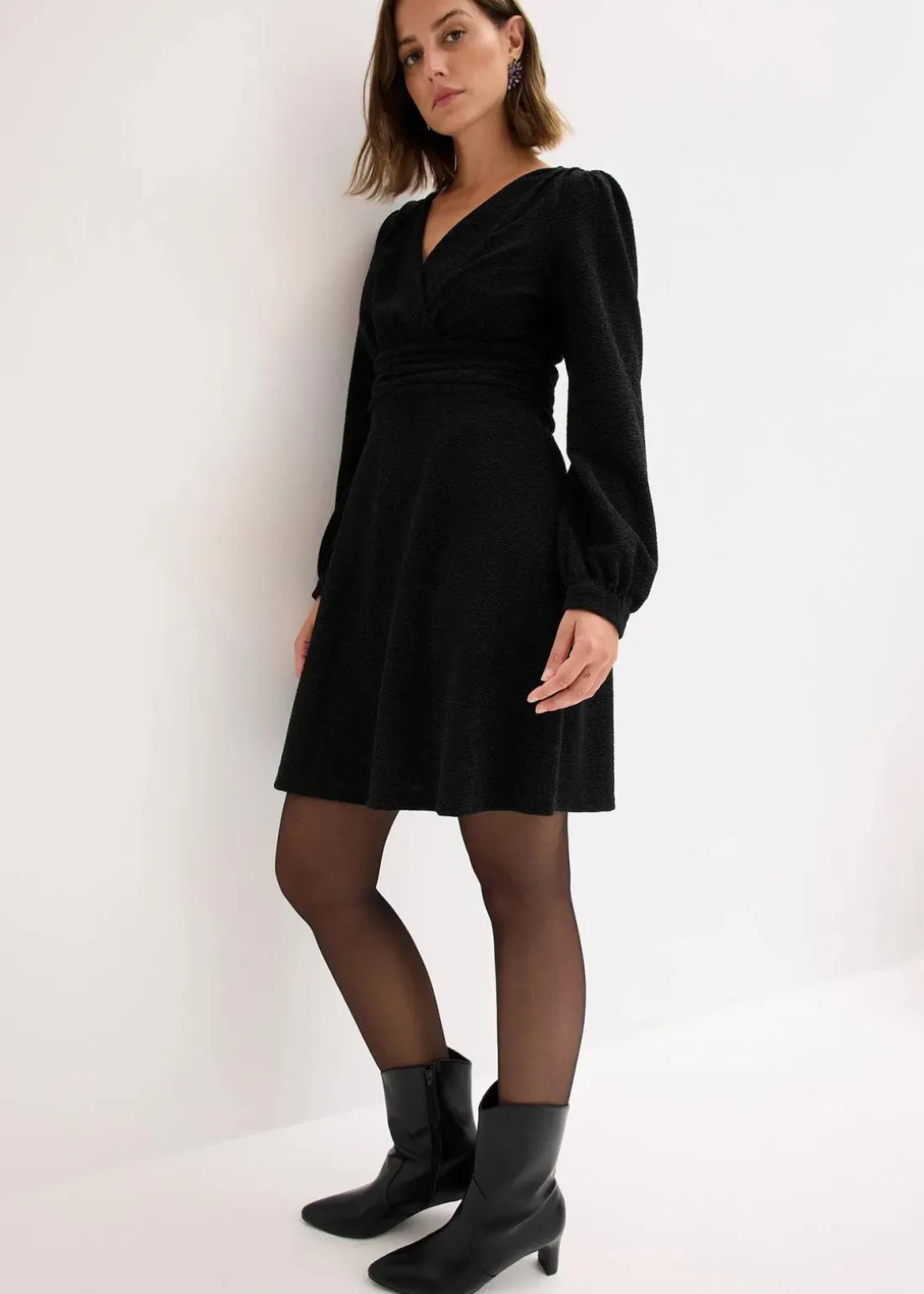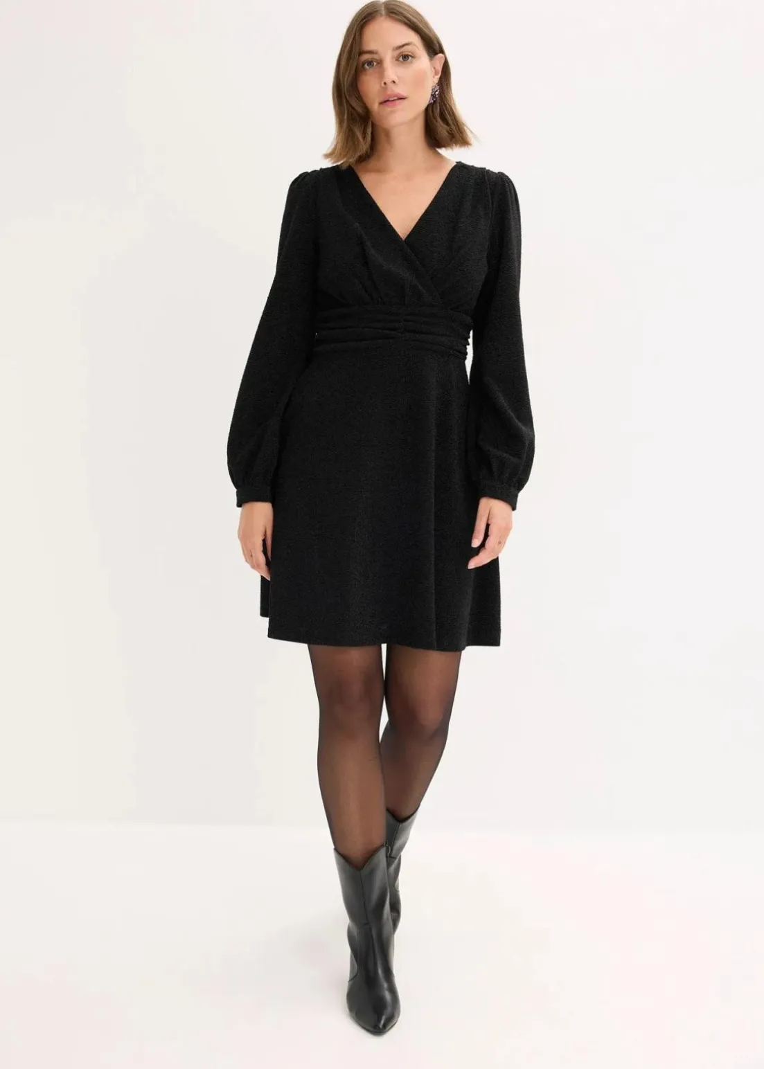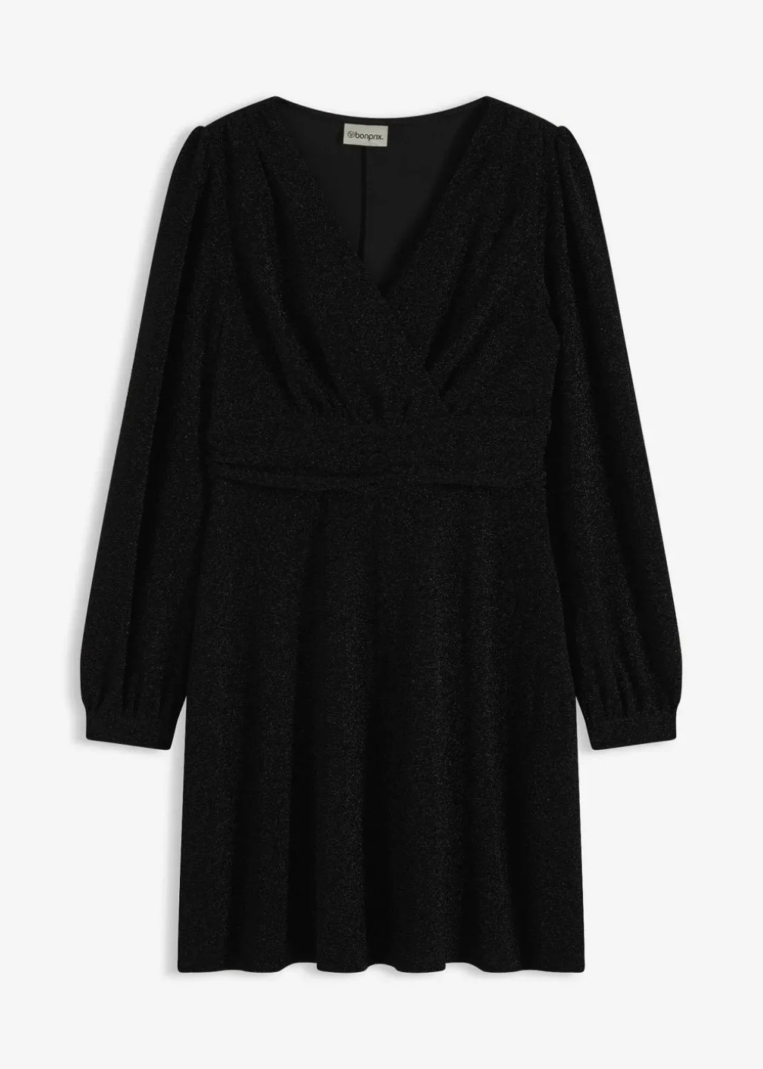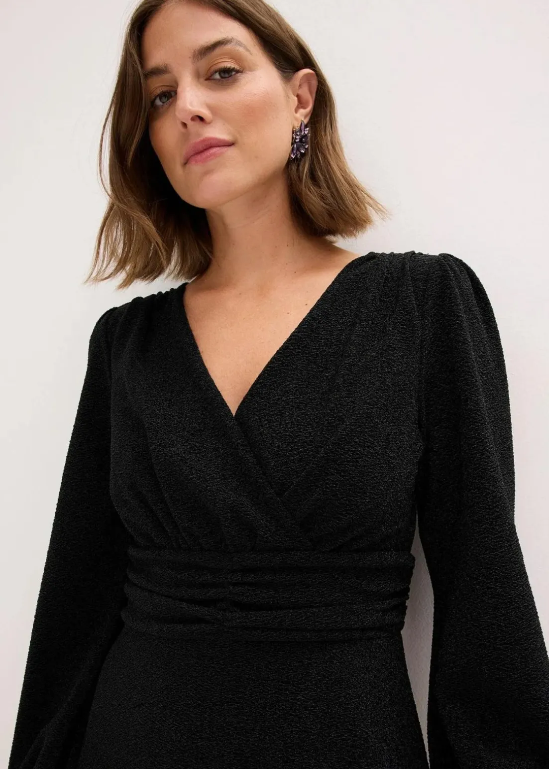 Modern und feminin: Ausgestelltes Minikleid aus glitzerndem Material in Wickel-Optik mit Ballon-Ärmel und Taillen-Einsatz