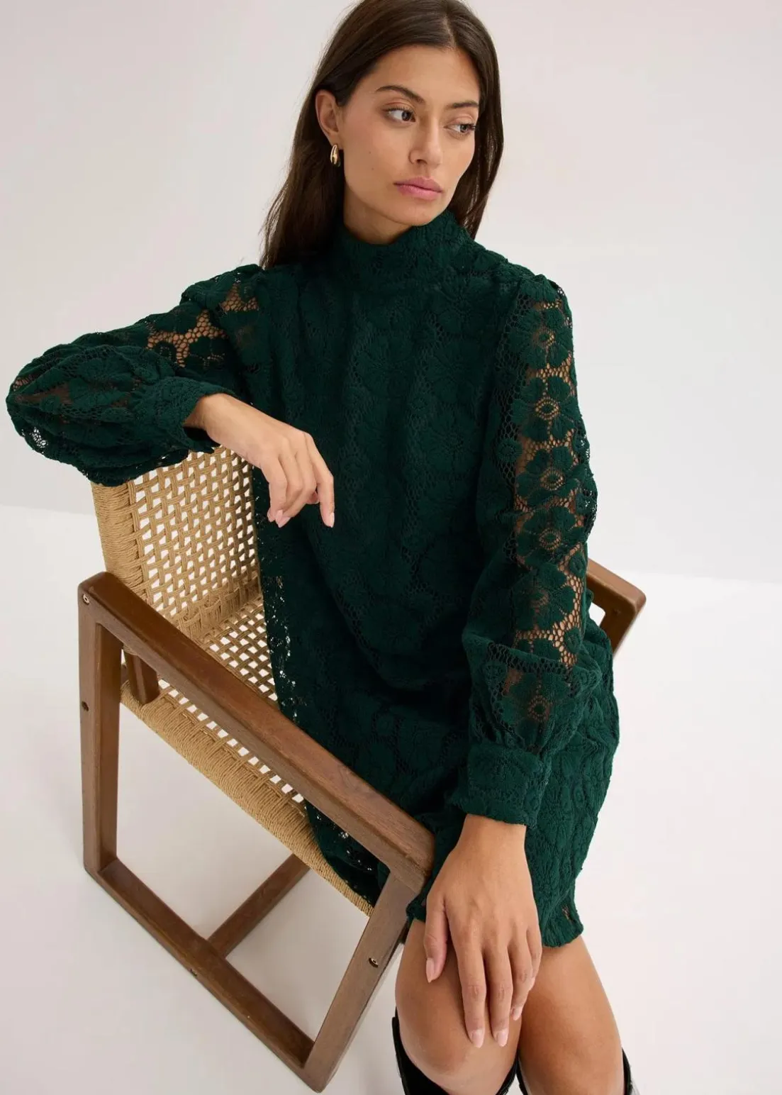 Trendiges, hochgeschlossenes MInikleid aus Spitze und langen Ärmeln