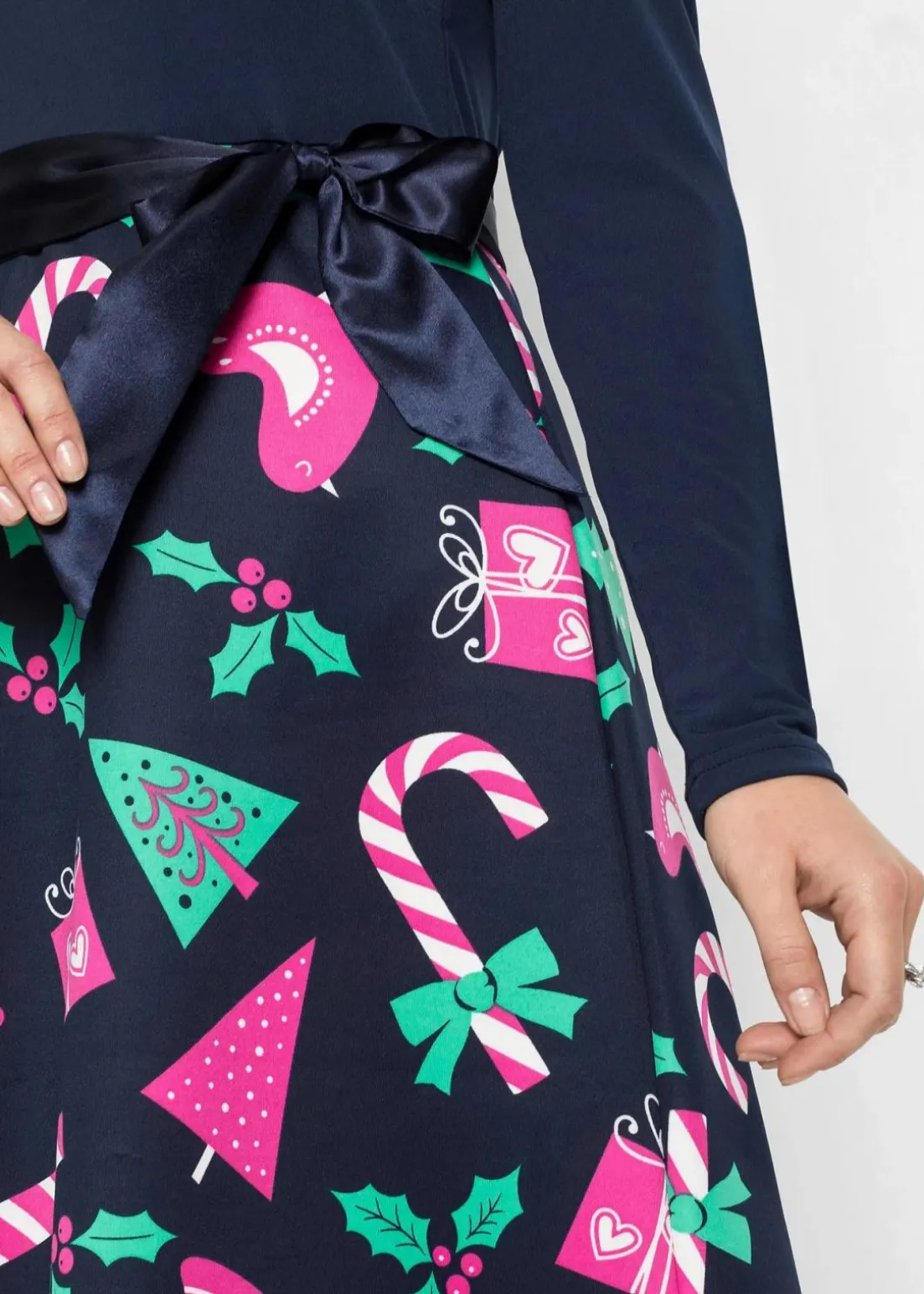 Verspieltes Kleid mit Bindegürtel und süßem Weihnachtsmotiv
